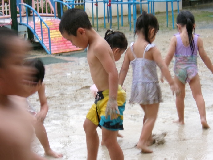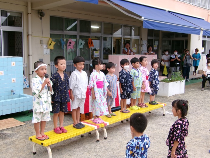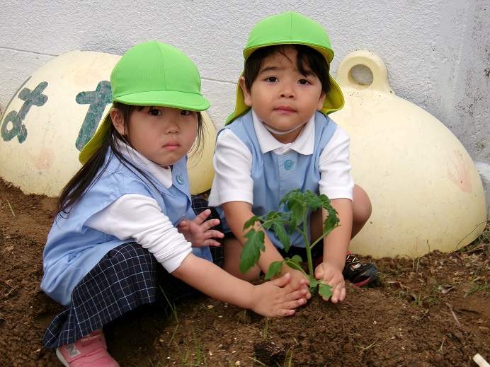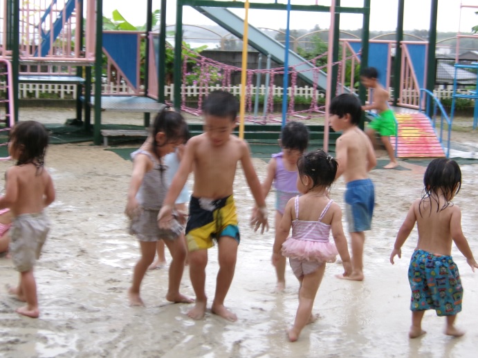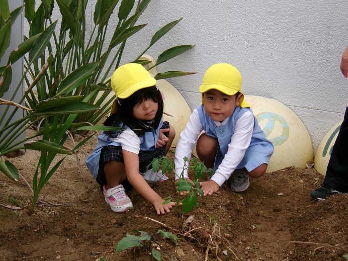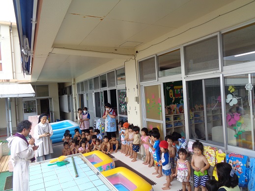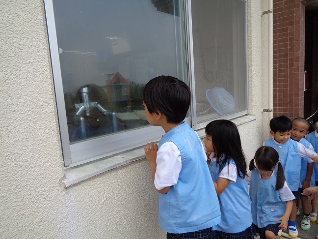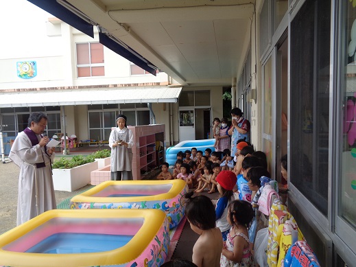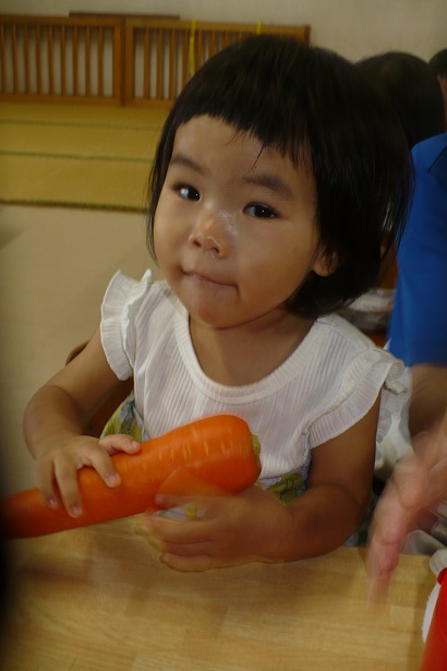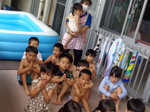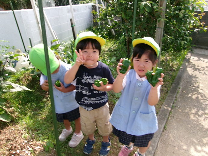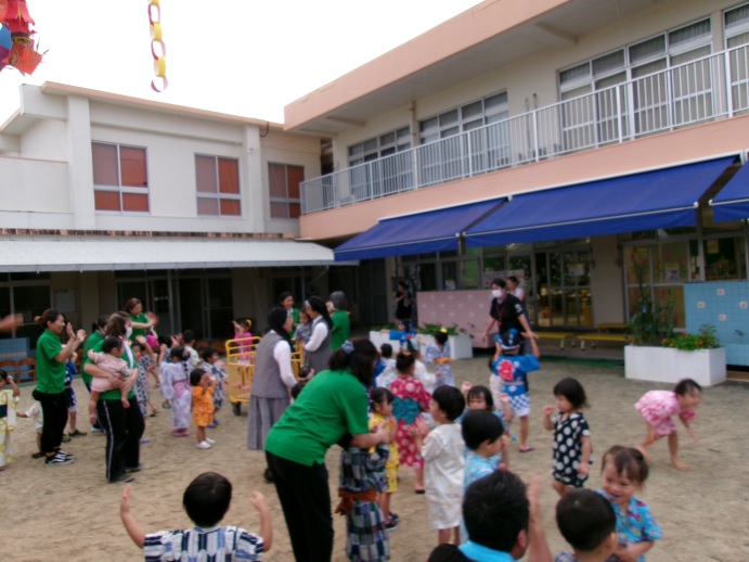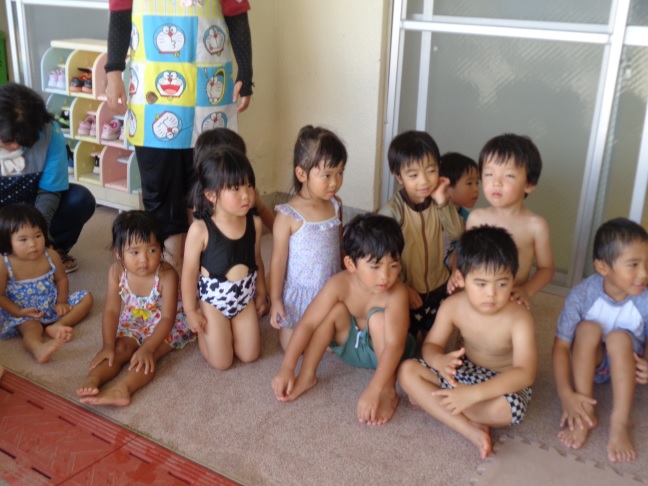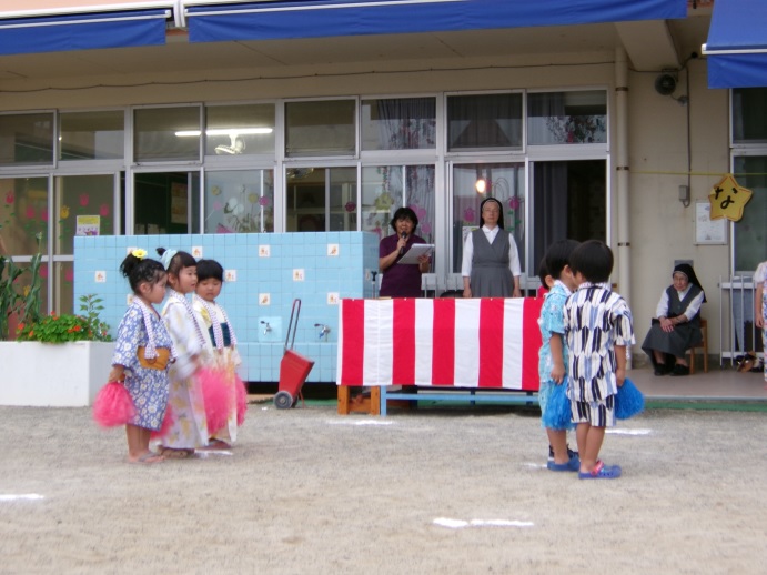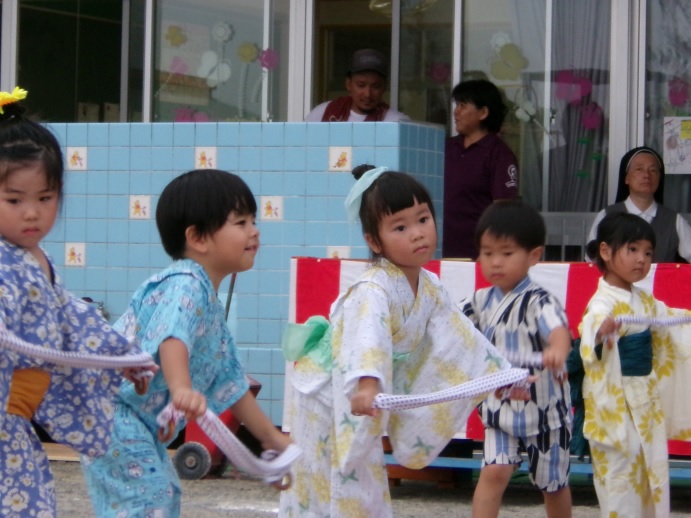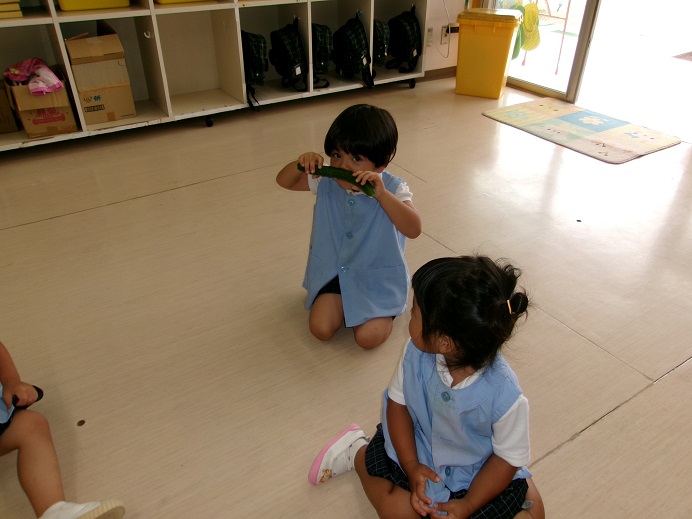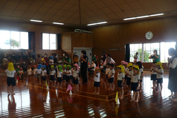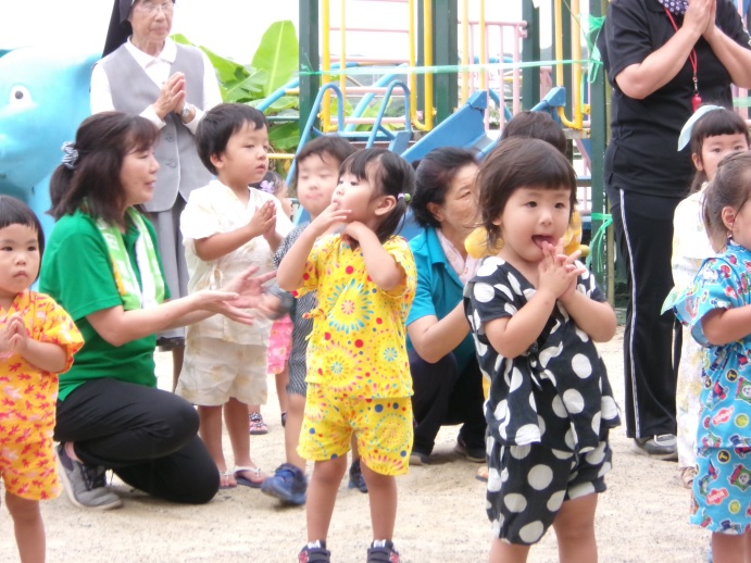 まず、お集まり、お祈り・聖歌、園長先生のお話、体操「今日も元気!」親子で「アブラハム」「サンサン体操」をしました。