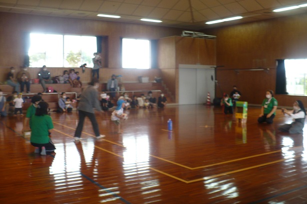 5才児は、ミニコーンでボールを挟み運ぶゲーム。 力加減が難しく、苦戦する親子もいれば、あっという間に運び終える親子もいました。全クラス盛り上がっていました。