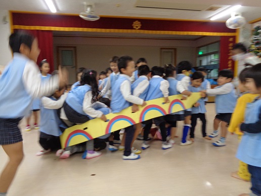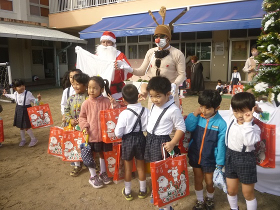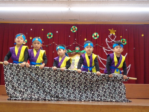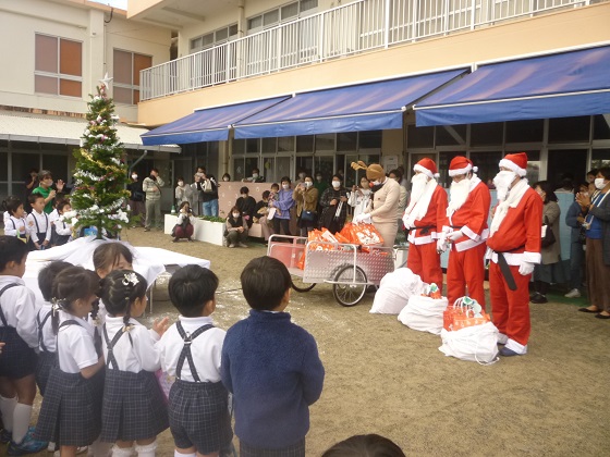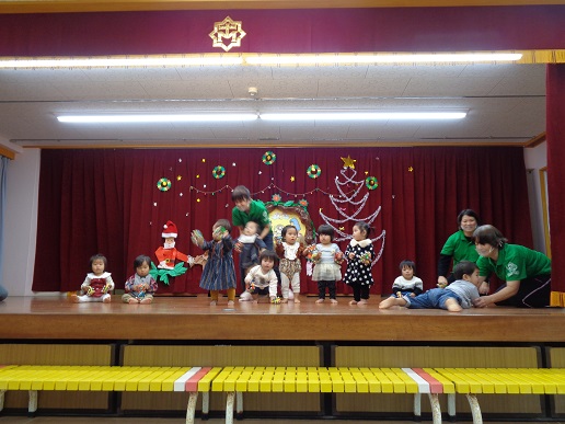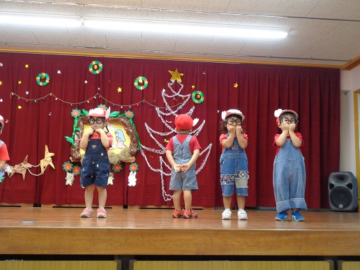 サンタクロースがトナカイの引くソリ(リヤカー)に、たくさんのプレゼントを乗せて登場!「やった!サンタクロースだ!」という歓声と「こわい~」と大泣きする泣き声と…。プレゼントをもらい、大喜びな子ども達!楽しいクリスマス発表会になりました。