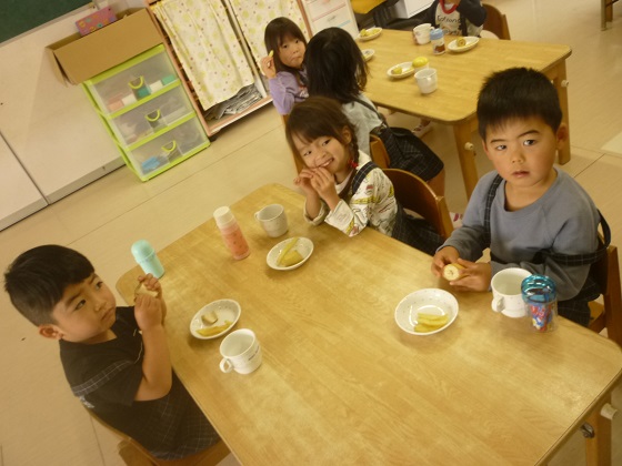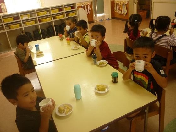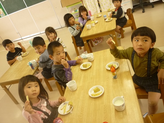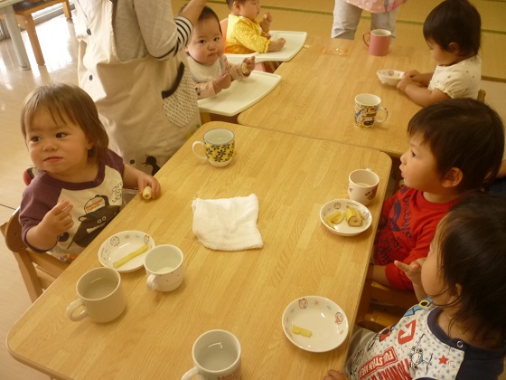 バナナの食べ頃を見逃さないように、子供たちがしっかり観察しています。そして、保育園に植えられているバナナの木にも花が咲いたり、実がついたり…これから楽しみがいっぱいです。
