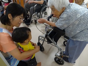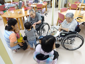 小さな子供達を見つめ「可愛いねー」と利用者さん、満面の笑顔!