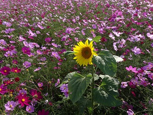 満開のコスモスの中に一輪のひまわりが咲いていました。びっくり!!