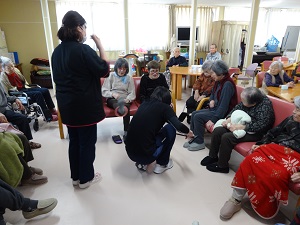 手を使って輪を回していくのはスムーズに出来ますが足になると利用者さんも難しそうに体のほうをクネクネさせていました(笑)