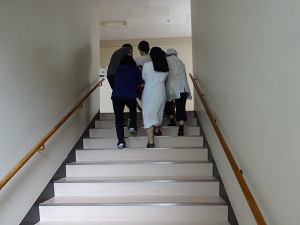 4人一組になり、実際に職員が車いすに乗り、1階から2階へ・・・・。