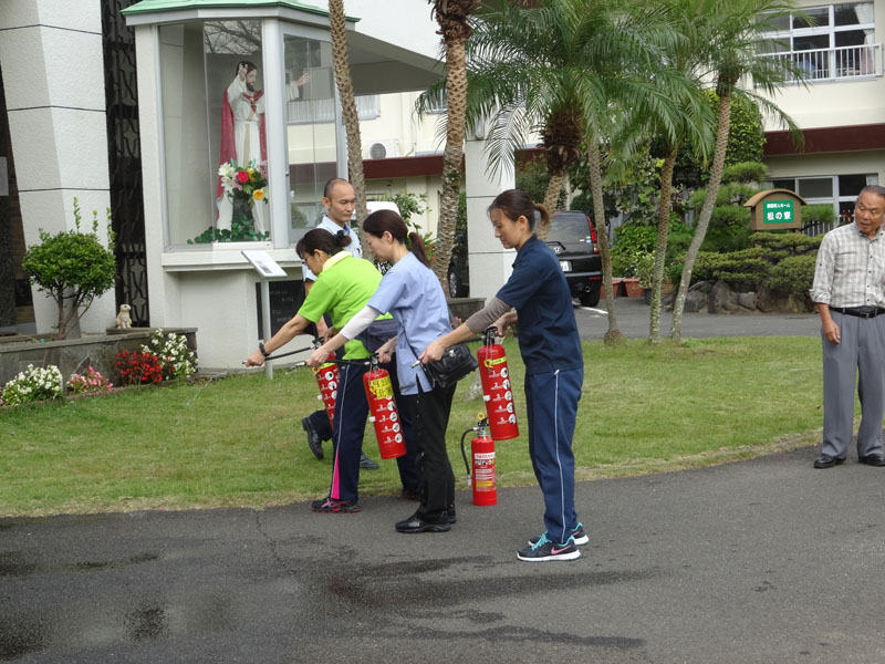 避難訓練後、毎年のことですが、消防署の方のご指導のもと、消火器の安全な使用方法