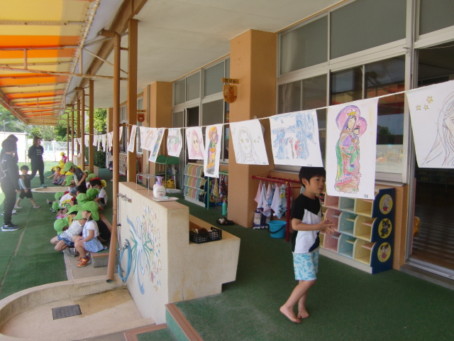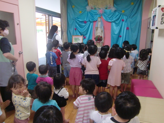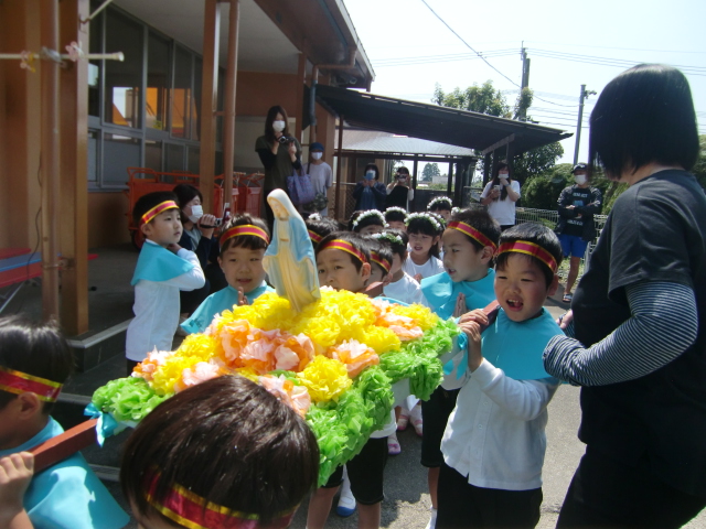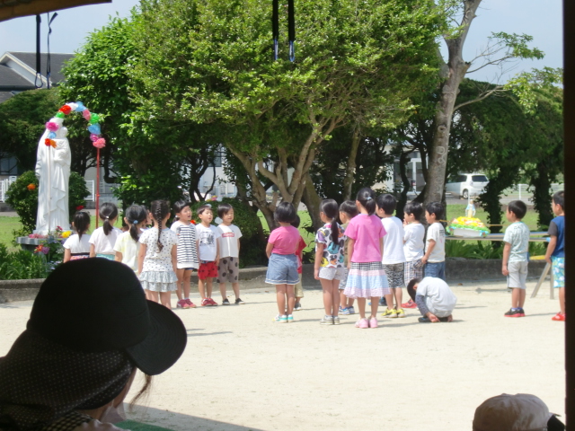 5月は「母の月」 聖母マリア様の月 https://www.cbcj.catholic.jp/faq/seibotuki/ です。子どもたちは朝のお集まりや一日の振り返りの時間にがんばったことなど振り返ります。そして、明日はそのがんばったことをマリア様の御手を通して神様にお捧げする日です。今日はその最終練習が行われていました。小さなお友だちはお部屋から…テラスから…