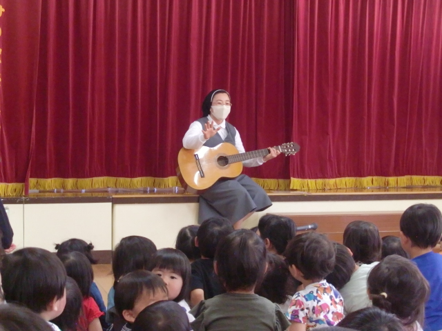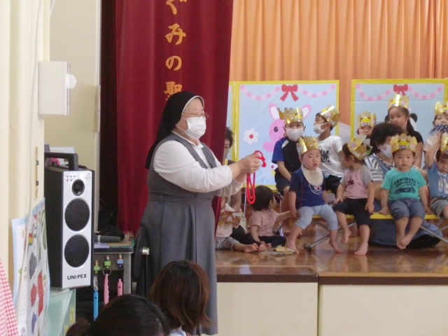 めぐみの聖母保育園では隣接した修道院が二つあります。早朝にいつもミサというお祈りが捧げられています。カトリック教会における 主の晩餐 ( 最後の晩餐 )に由来する 聖体 の 秘跡ですが。今朝は6月にお誕生日を迎えられた子どもたちと先生たちのために特別にミサが捧げられました。毎月誕生日ミサが捧げられていますが、お知らせするのは初めてです。(ミサの様子)高鍋教会の主任司祭であります平田神父様が毎朝修道院に訪れてくださりミサを捧げてくださいます。