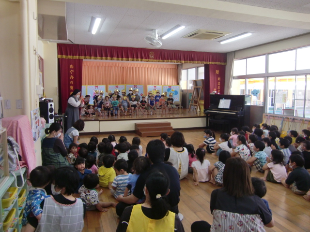 先日、4,5月のお友だちと先生方のお誕生日会が行われました。園長先生のお話とマジックショー、幕間に「サンタ・マリア」の歌のプレゼント、先生たちからのプレゼントがありました。