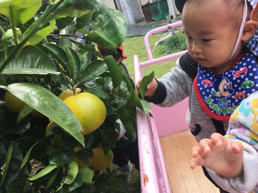 また、散歩の途中でみかんを見つけ嬉しそうな子どもたちの姿も見られました。