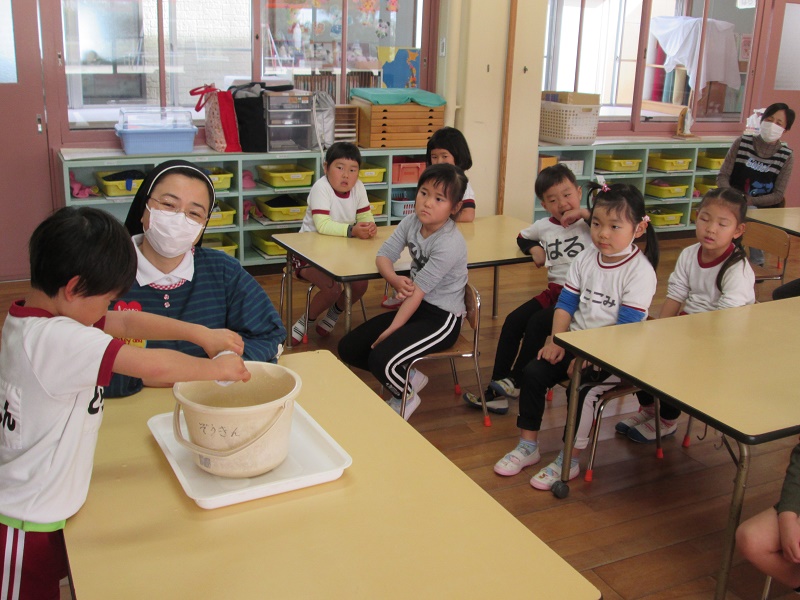 めぐみの聖母保育園では隣接した修道院が二つあります。早朝にいつもミサというお祈りが捧げられています。カトリック教会における 主の晩餐 ( 最後の晩餐 )に由来する 聖体 の 秘跡ですが。今朝は6月にお誕生日を迎えられた子どもたちと先生たちのために特別にミサが捧げられました。毎月誕生日ミサが捧げられていますが、お知らせするのは初めてです。(ミサの様子)高鍋教会の主任司祭であります平田神父様が毎朝修道院に訪れてくださりミサを捧げてくださいます。