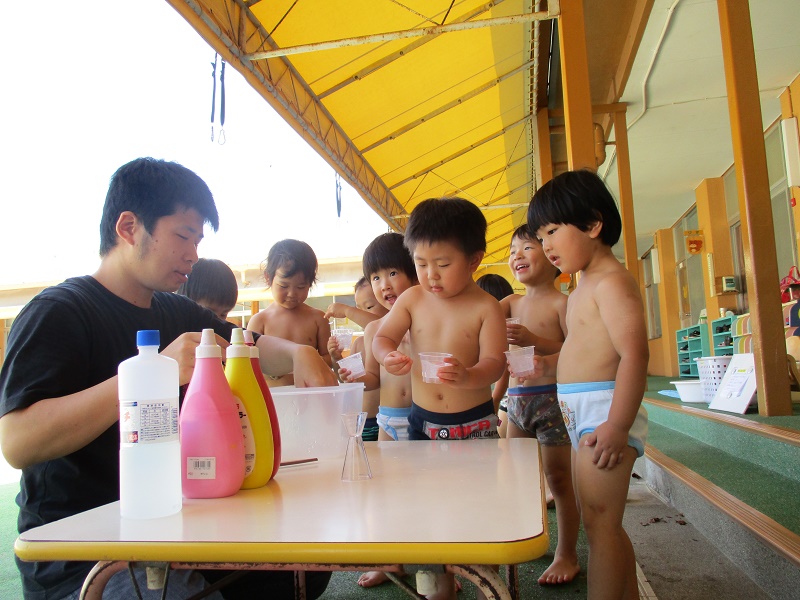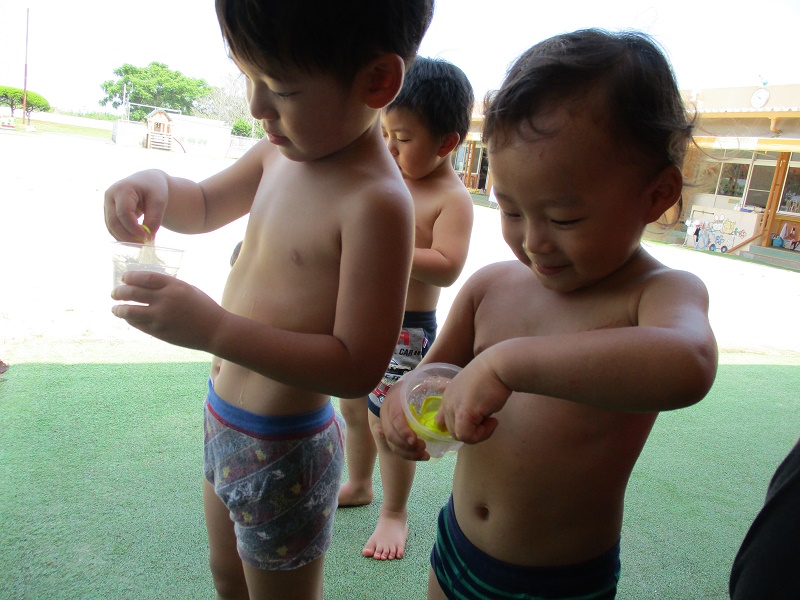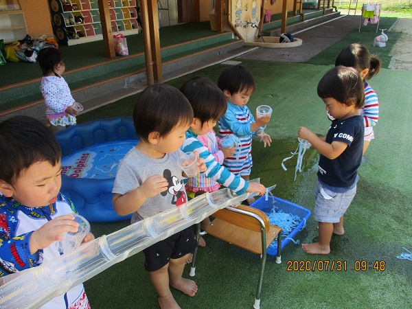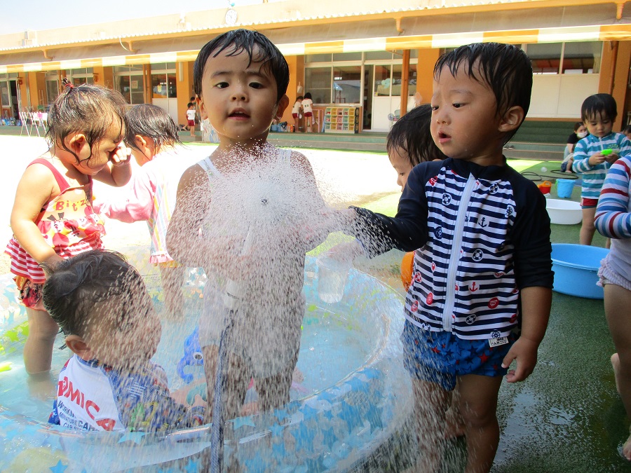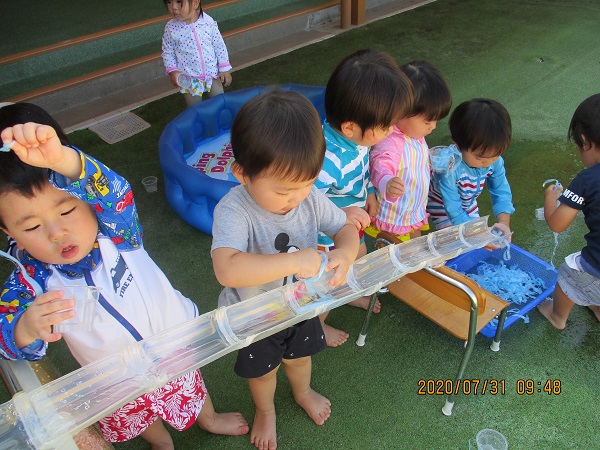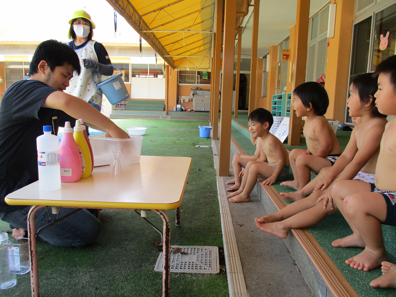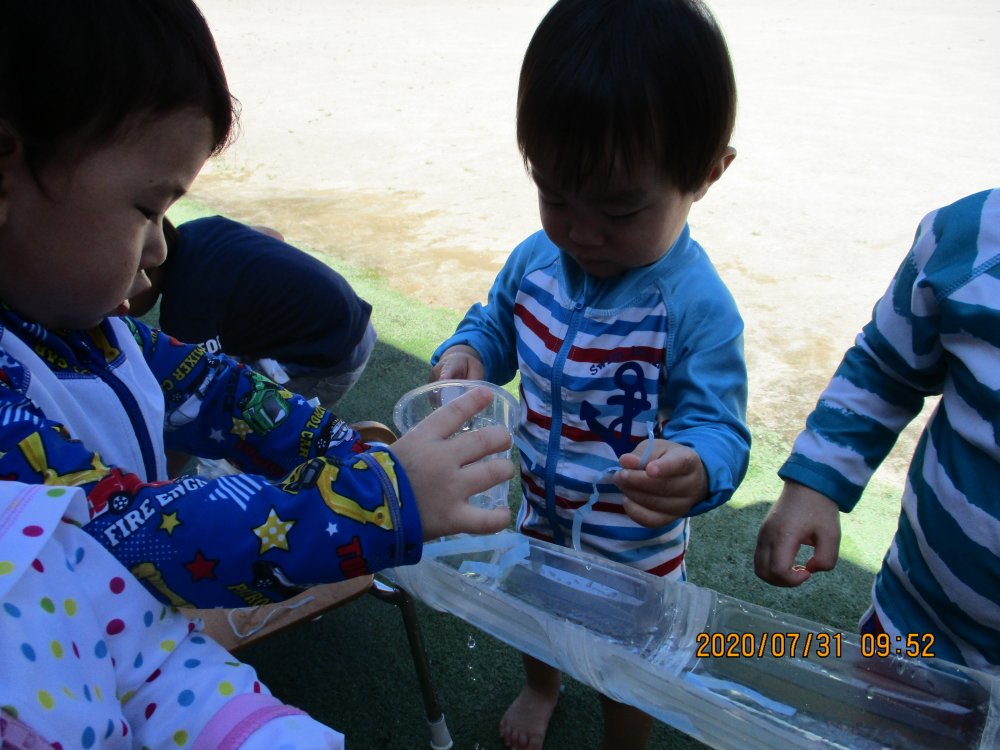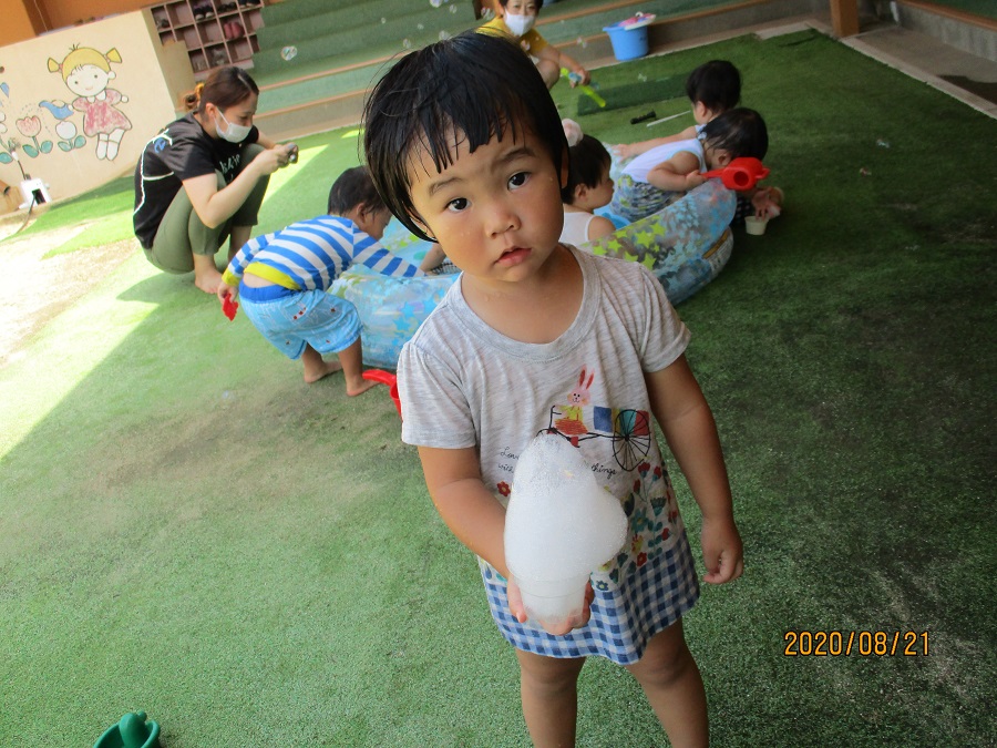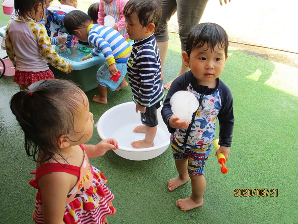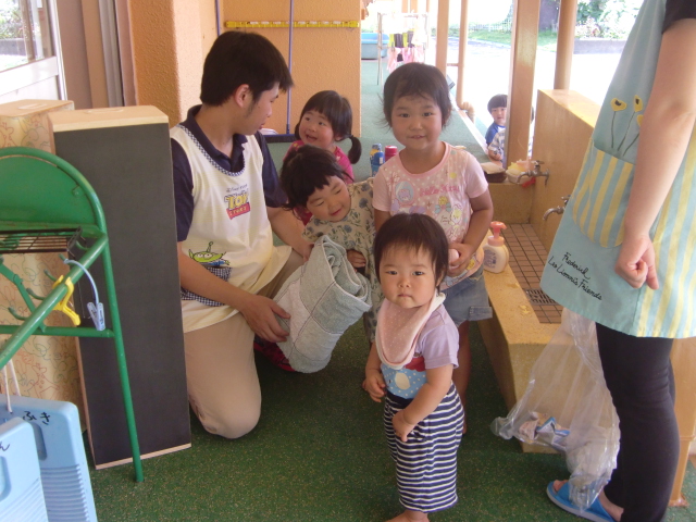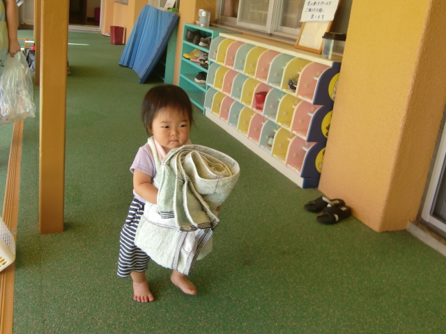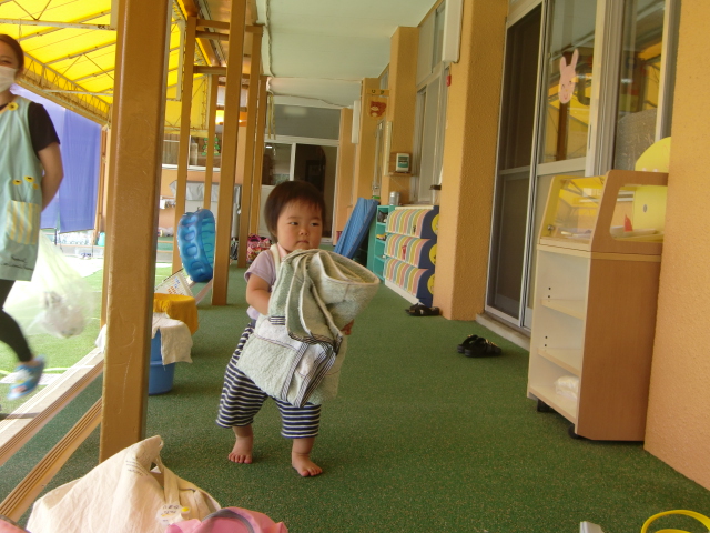 水遊びの時に使うマット…パンダ組さんに届けてくれるかな~!お返事があったかはわかりませんが。途中から取材させていただきました。言葉にできないけれど…お洗濯ものを届けてくれたりす組のお友だち。パンダ組の先生たちもお姉ちゃんたちもあったかい笑顔で迎えてくれます。