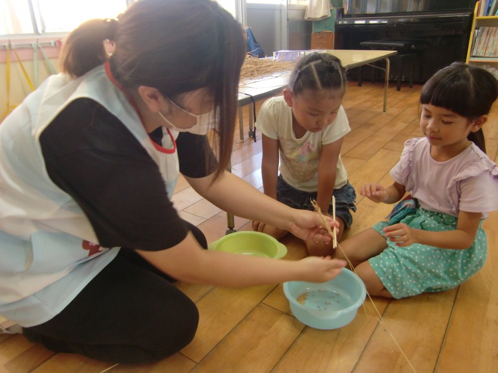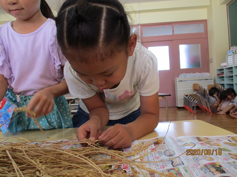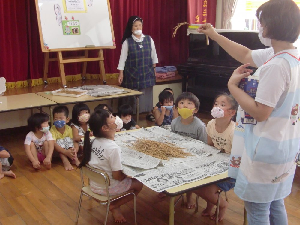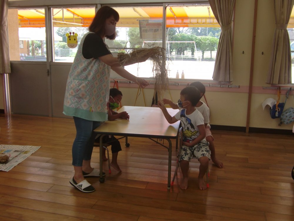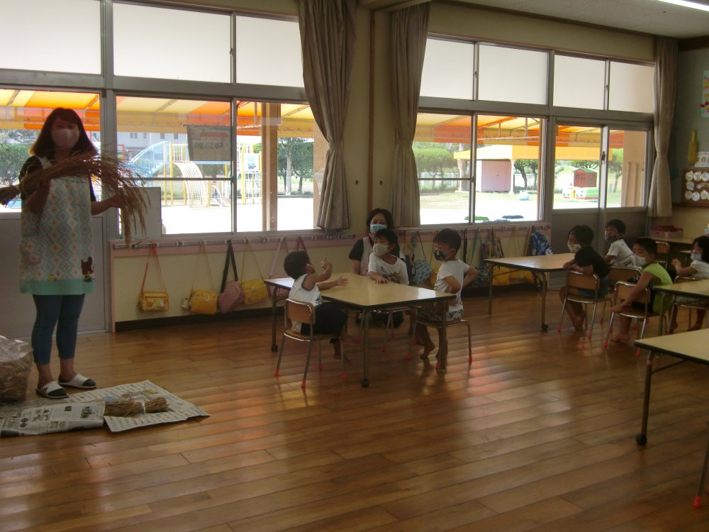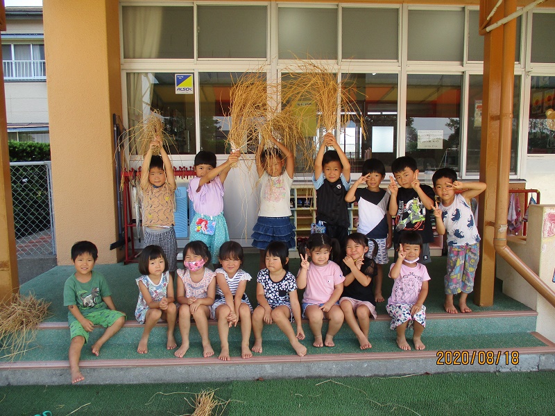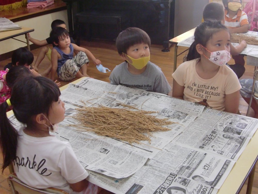 春にみんなで植えた稲が大きく成長し稲刈りをしました。