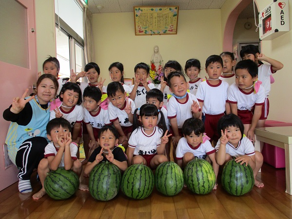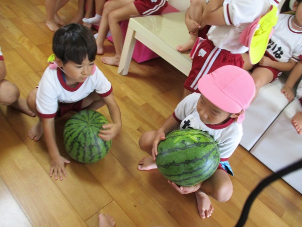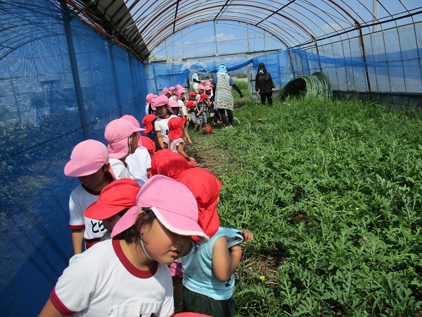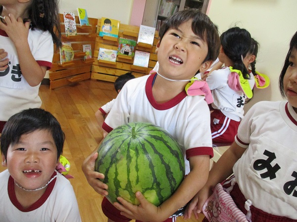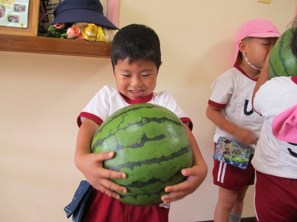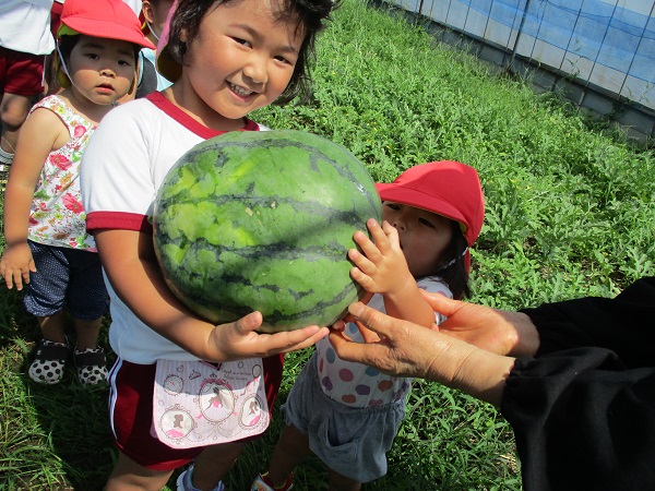 事後報告となりますが、みんなでスイカの収穫に行きました。地域の方にいただいたスイカもありましたが…実際にスイカがどんな風に育っているのか見せていただきました。子どもたちも大変喜んでいました。