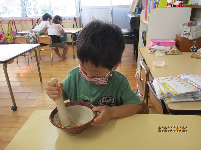 その後は、すり鉢で野球ボールを使ってもみすり。
