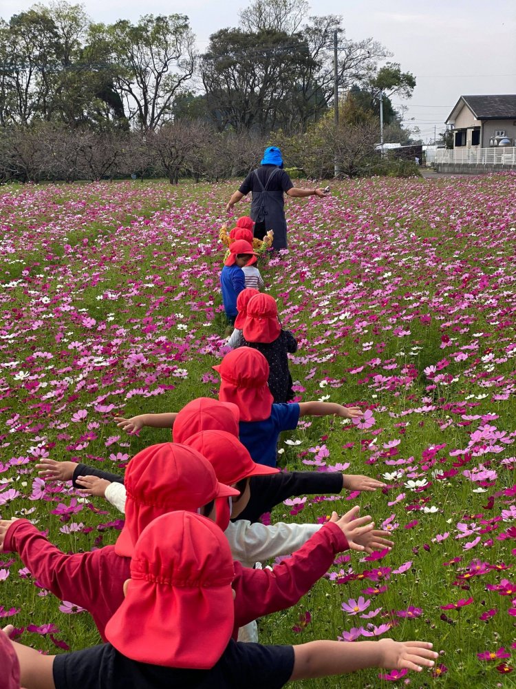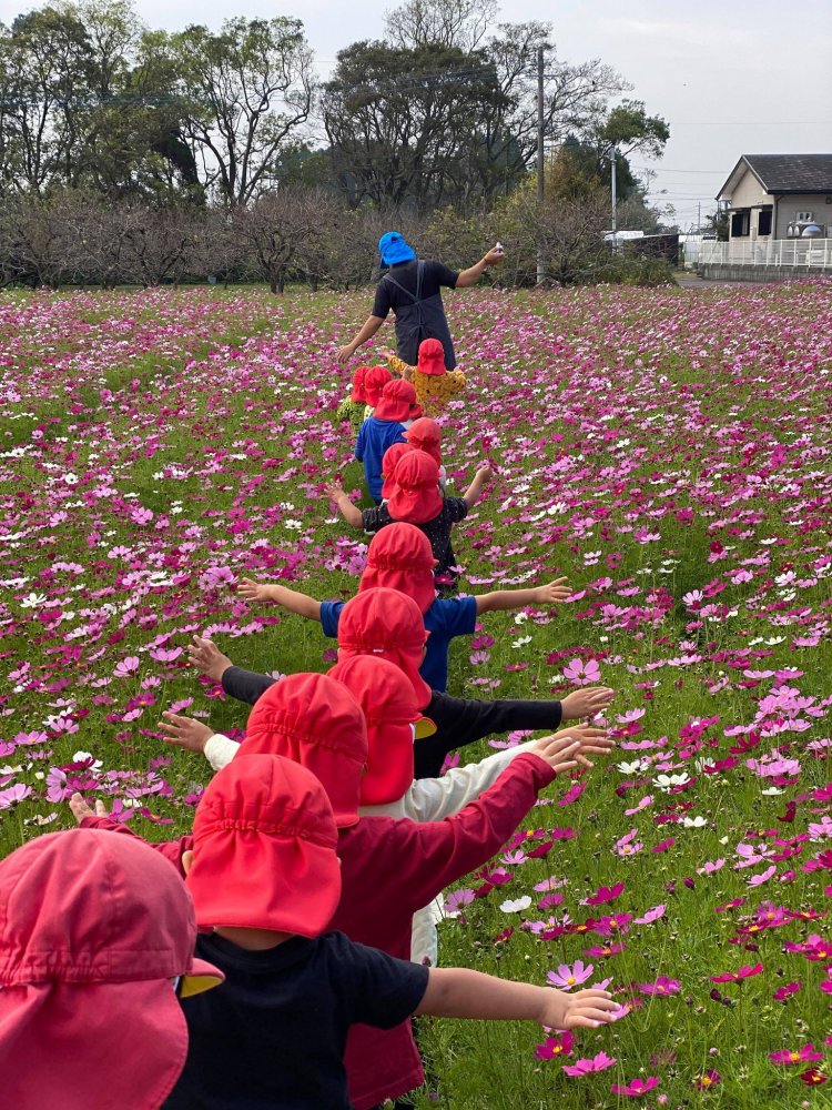 いつもお世話になっているお隣のアントニオ修道院のシスター方がコスモス畑で子どもたちがお散歩できるようにと種をまいてくださいました。そして今日そのお散歩の日!みんなで仲良くお散歩です。赤やピンクや白や…優しいコスモスが私たちを歓迎してくれました。あまりの感激にコスモス畑にたおれこんでいるお友だちもいました。優しいコスモス畑で優しい人になれるようにゆっくりゆっくり歩いていくことができますよううに。先生の後を歩く子どもたちがかわいらし歩みを見せています。アントニオ修道院のシスター方、いつも私たちを見守ってくれてありがとうございます。