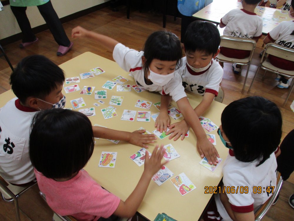 色々な食材のカルタをしました。やまいも・セロリ・アスパラガス。知らない物もありましたね。その後、4つの栄養素に分類。