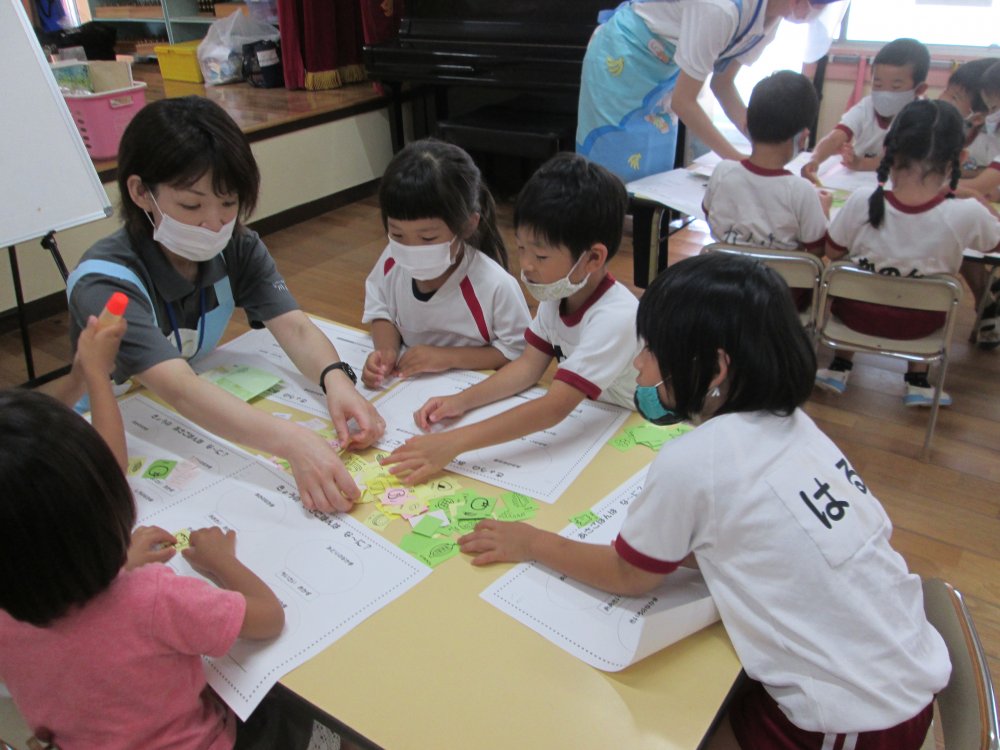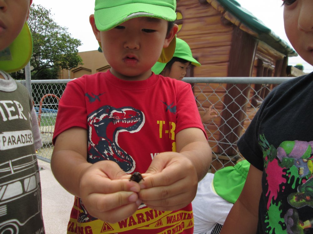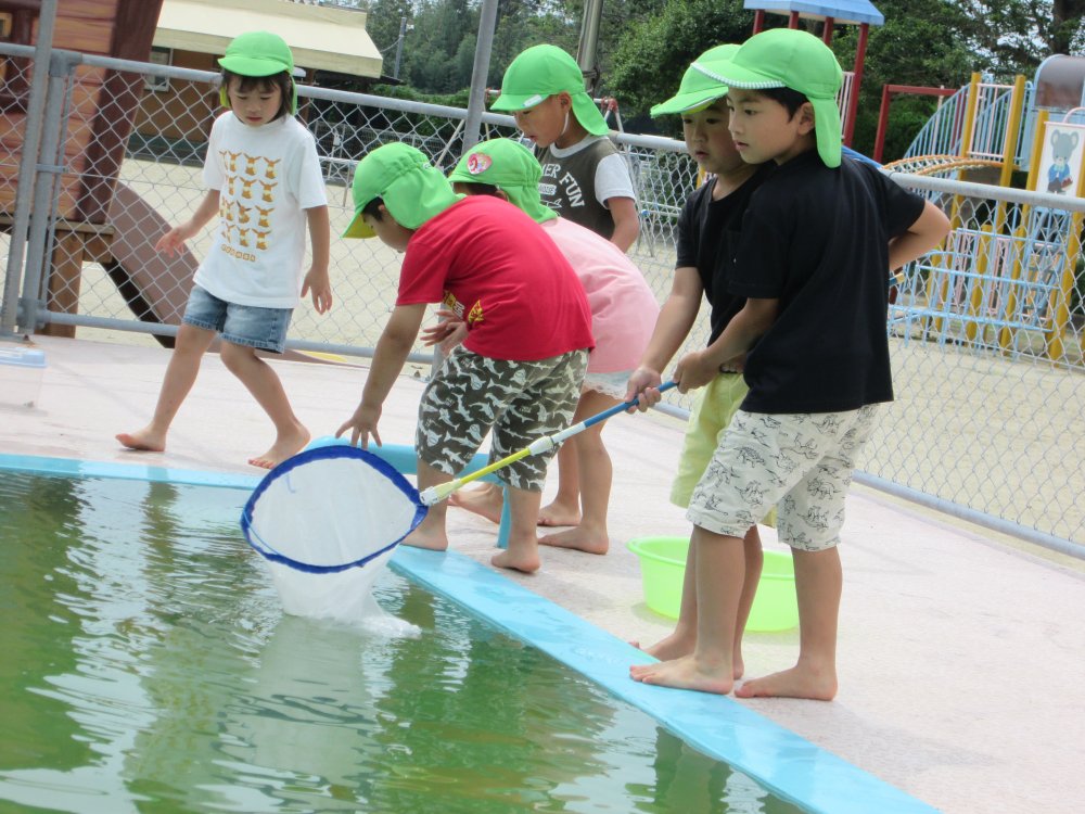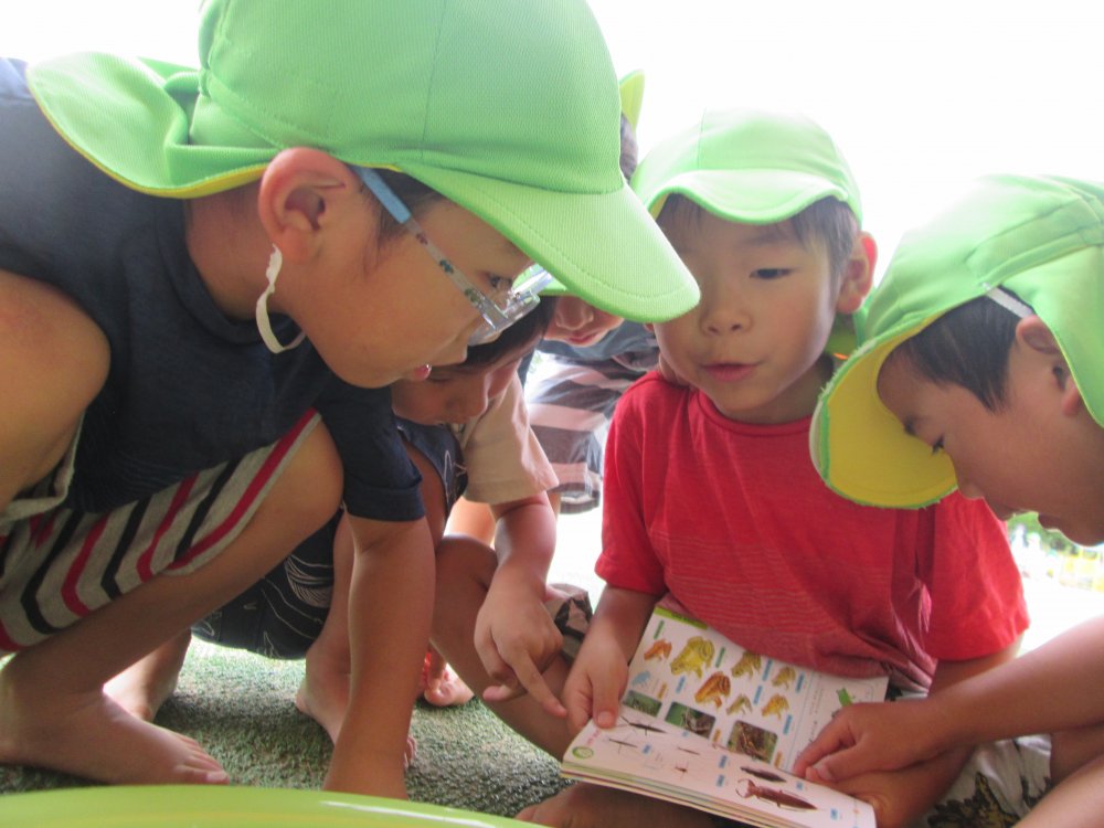 「わあ~いるいる」と、目をキラキラさせて、プールの中を覗き込んでいるぞう組さん(年長児)たくさんの生き物を見つける事ができました。「これはな~に?」と自分たちで図鑑を持って来て調べる姿も見られ、いろいろな発見があったようです。