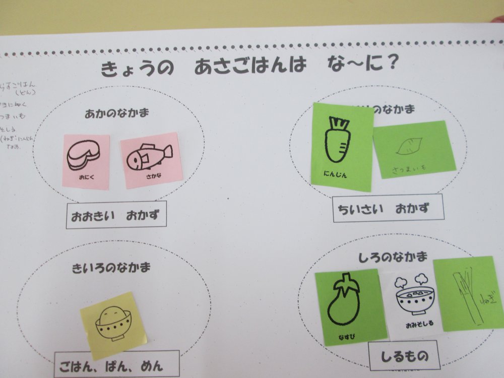 「朝ごはんは、何を食べてきたかな?」食べてきた物を色分け・分類しました。