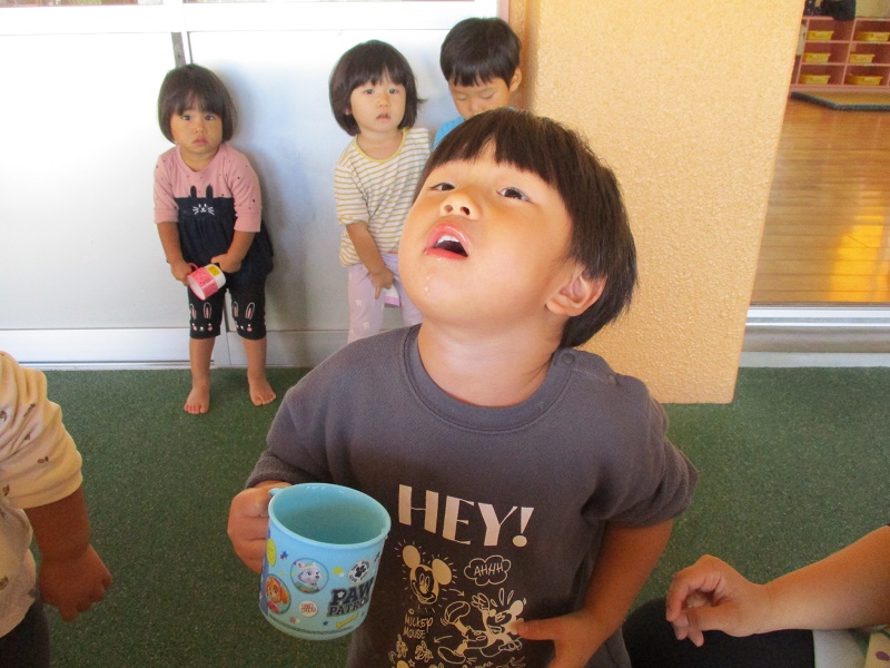 「お家でもしているよー。」と教えてくれる子もいて、練習を楽しみにしていました。ガラガラうがいをやってみると、口からお水がこぼれたり、飲み込んでしまったりして難しく感じる子もいましたが、興味を持って挑戦していました。