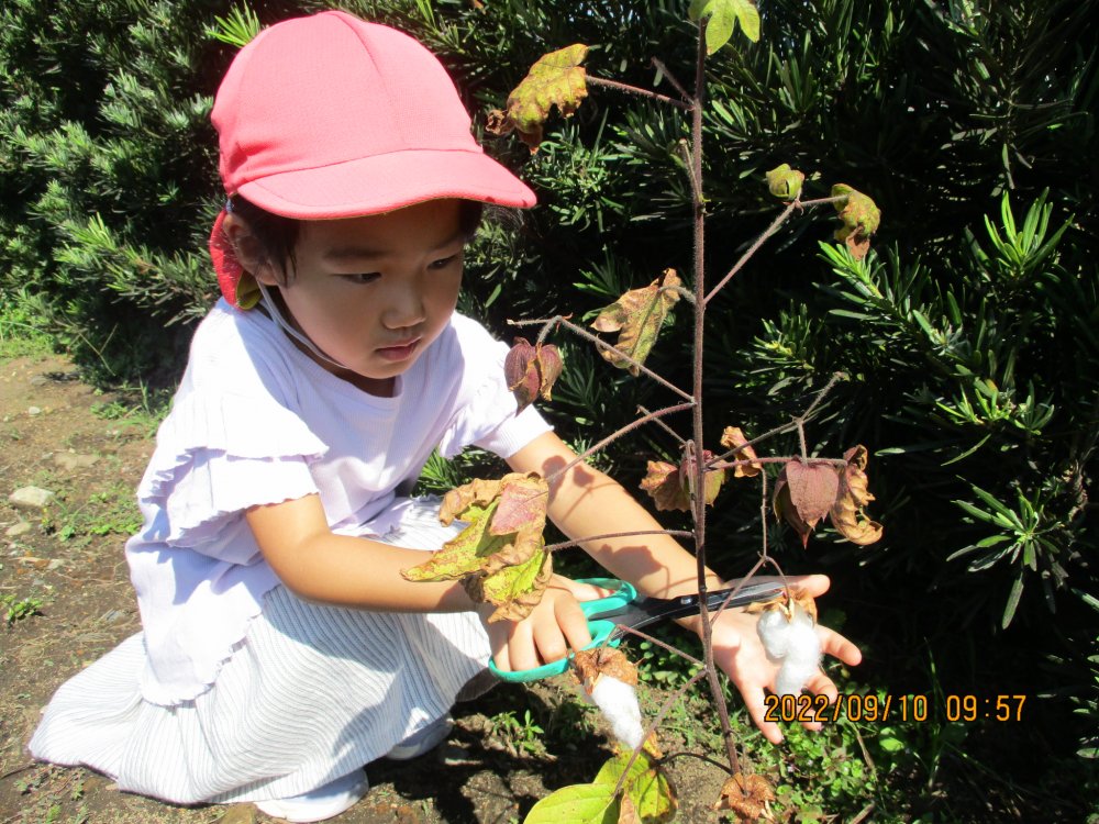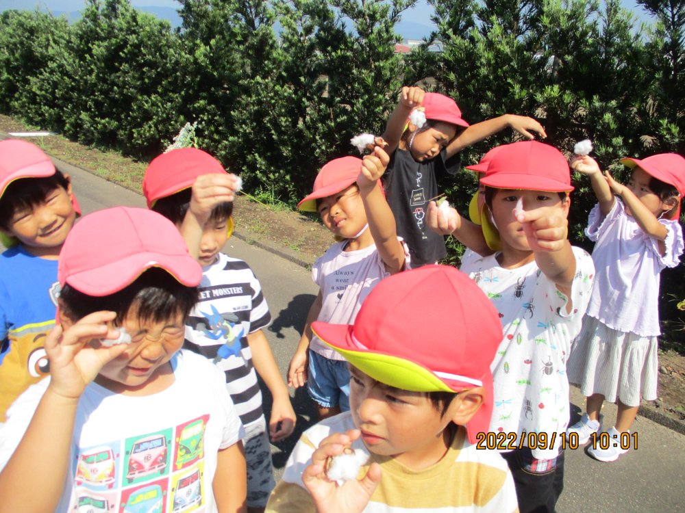 綿になる前の果実を見せて「お花が枯れたらこの実がなるんだよ」と伝えると「また見た~い」と大興奮でした。