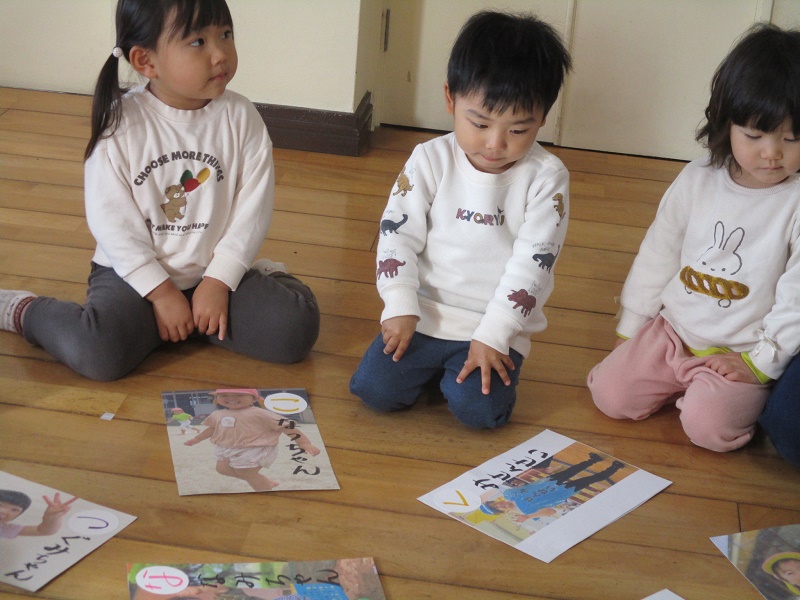 少しずつ文字にも興味を示すお友だちもいます。これからも、遊びの中で文字に触れる機会を取り入れていきたいと思います。