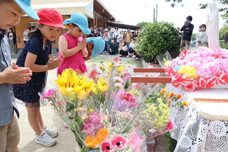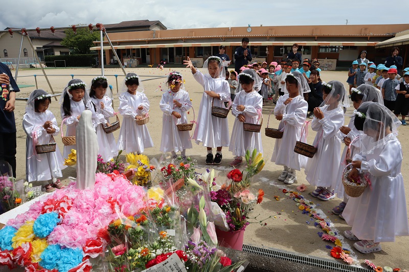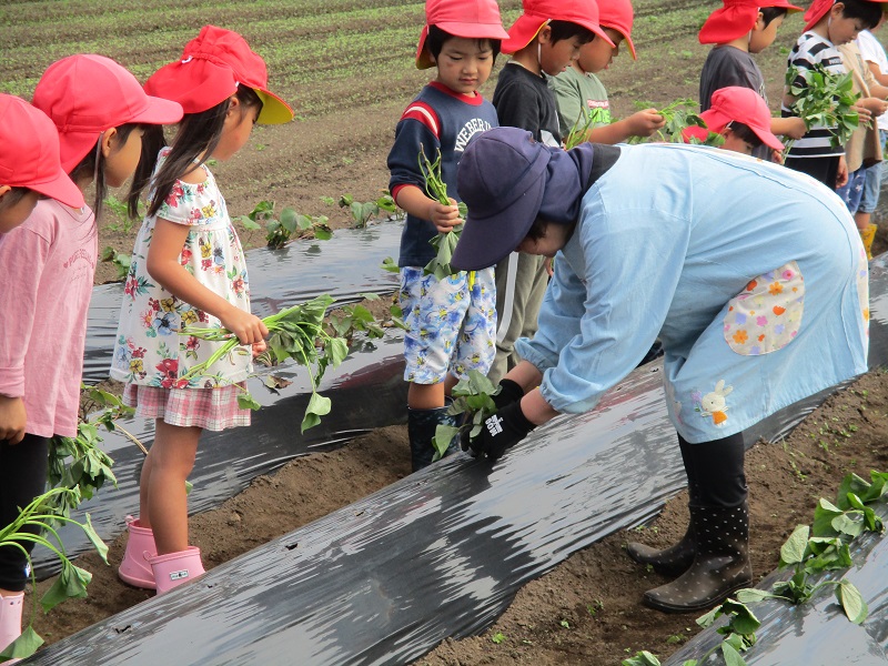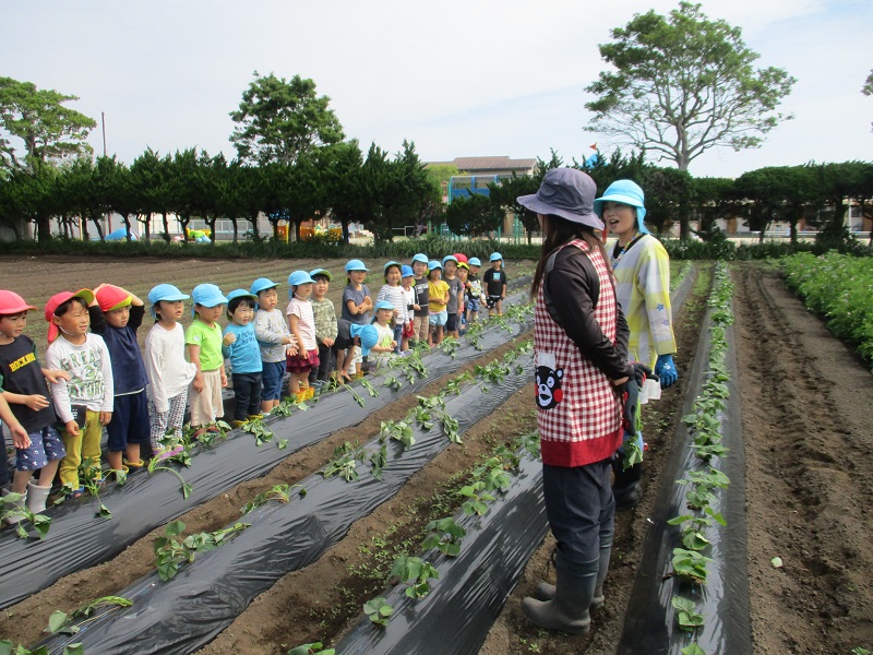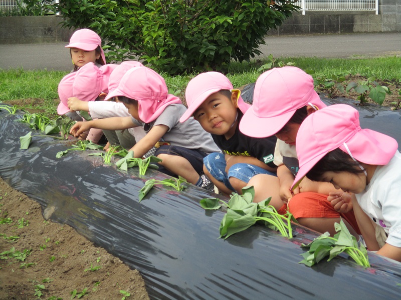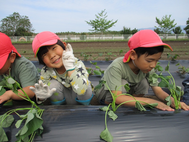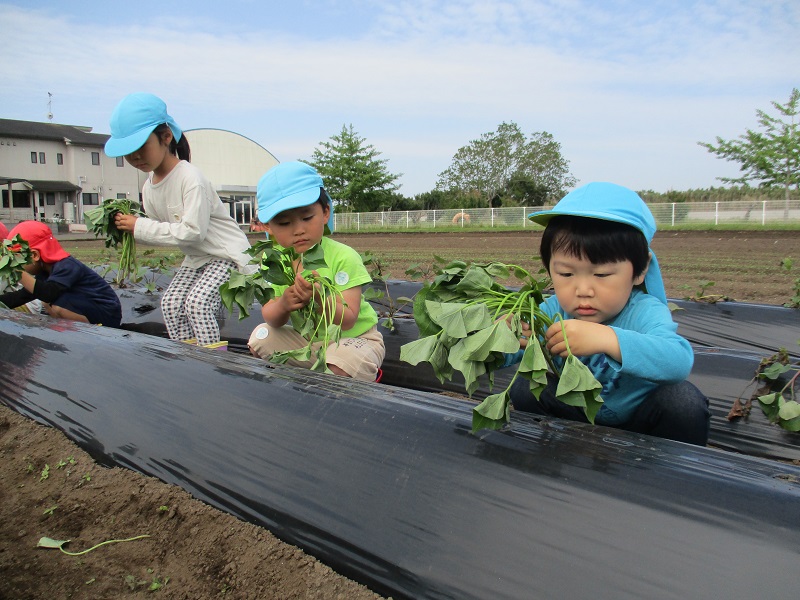 5月12日、ぞう組さん、きりん組さんは芋の苗を植えました。柿原さんに教えていただきながらの芋の苗植えはとても楽しかったようです。