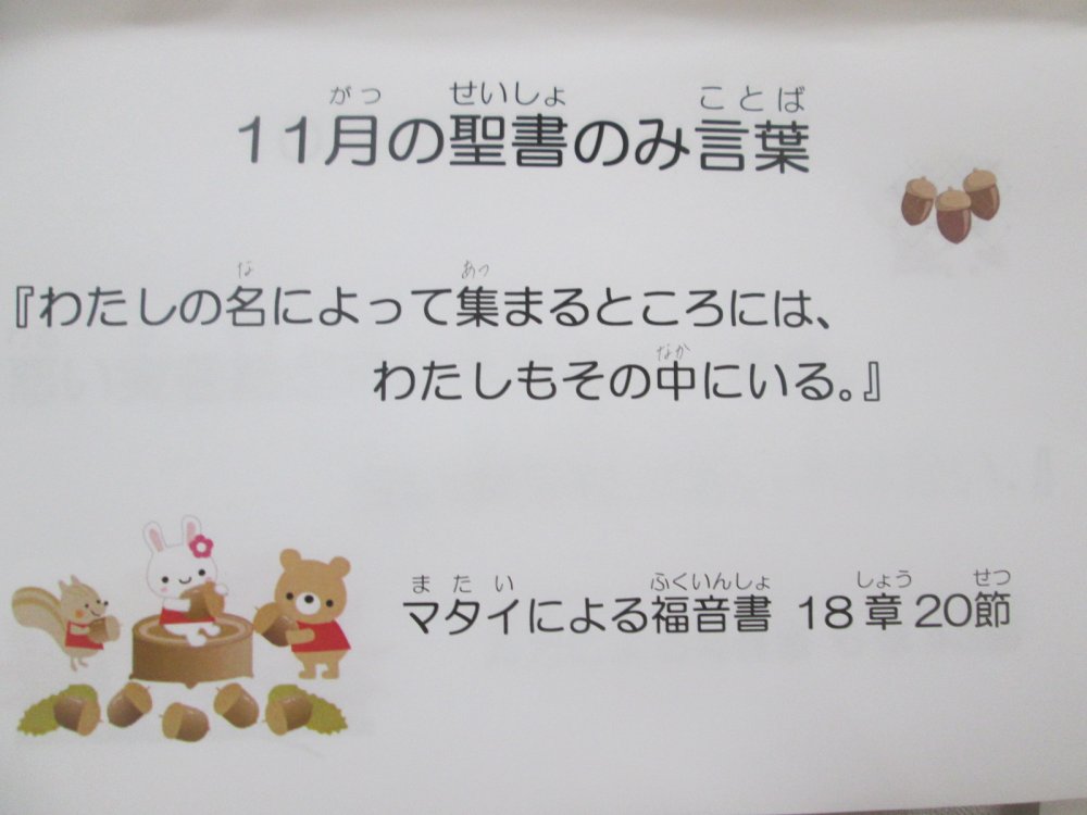 イエス様は、ご自分の名によって人と人とが集まるところには、必ずそこにいて下さると教えて下さいました。集まりの中のいったいどこにおられるのでしょうか?それは一人ひとりの間、心の中だと思います。イエス様が私たちの間にいて下さるから、私たちは愛し合う事、赦しあうことを学び、それを実現していくことができるのです。イエス様を間にして大きな輪ができた時、平和への願いがこの世で神様によってかなえられるのです。私たちの身近にいる子どもたちの中に起こる小さな争いごとのなかでも、手をつなぐことで、そこのイエス様がおられることを感じていきたいものです。