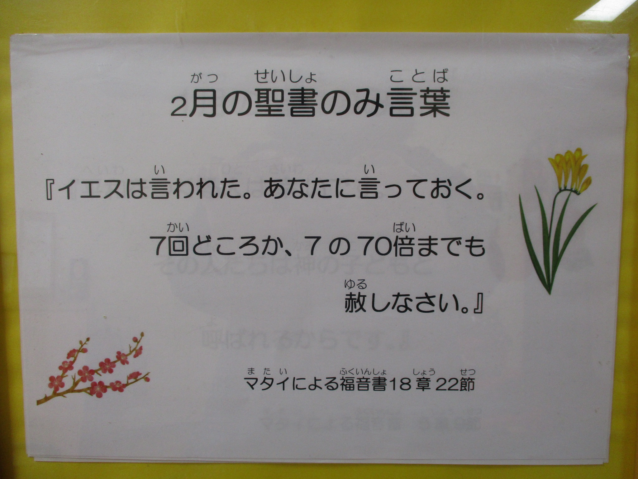 これは、「何回他人をゆるしたらいいのですか?」と言う弟子の質問に対するイエス様のお答えです。文字通りに理解すれば、7×70=490回ゆるせば終わりだと考えてしまうかもしれません。しかし聖書の世界では7は完全を表す特別な数字です。だから、ここでは「限りなくゆるしなさい。」という意味になります。ゆるすとは愛することにつながります。そして、幸せや平和をもたらします。今の世界に一番必要なことではないでしょうか。イエス様は生涯をかけて「ゆるすこと」を人々に教えます。