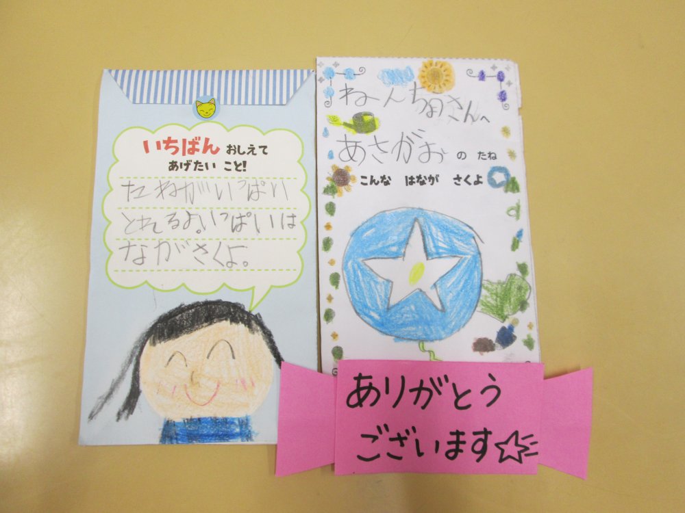エントリー 朝顔の種が届いたよ! 2020/11/02 11:19 小学校1年生から朝顔のたねが届きました。 自分たちで好きな種を選び、保育園にも頂きました。 来年、植えるのを楽しみにしています。 この記事のURL ページ移動 記事一覧 初めての交通安全教室秋の遠足