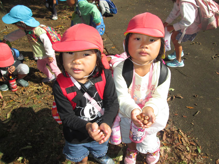 始めにどんぐりひろいをしました。大きいどんぐりがたくさんあり、