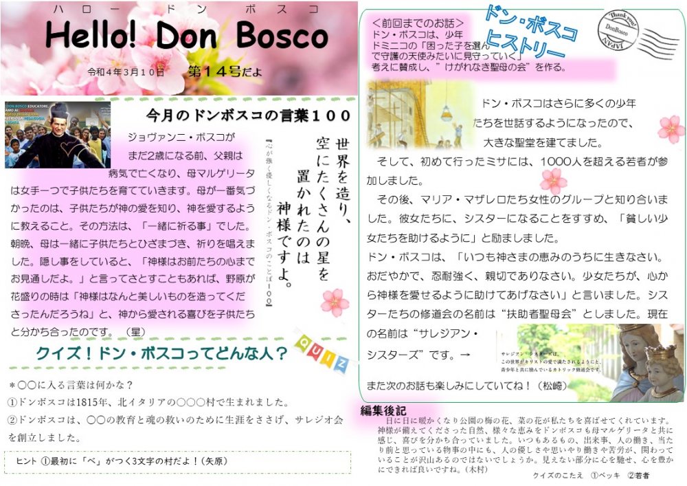年に数回寮内で発行している「Hello!Don Bosco」も14号です。