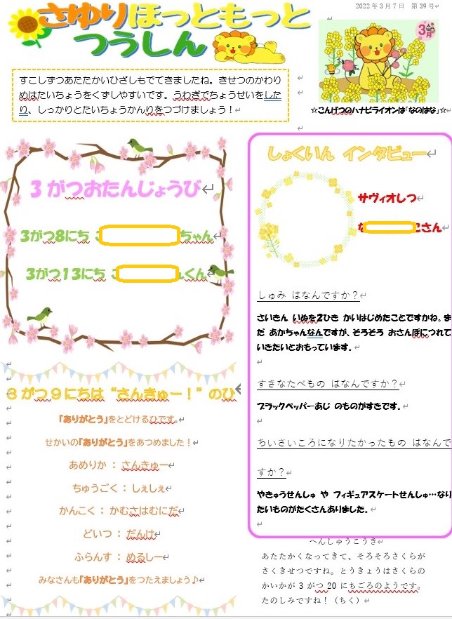 季節ごとのハナビライオンも登場し、通信の裏面はぬりえになっており