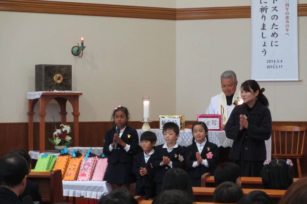 子ども達は、博士たちのようにクリスマス会へ向けて集めた献金を一人ずつお捧げしました。…うた「グローリア」「ようこそイエスさま」この劇を通して、いただいたたくさんのお恵みに感謝したいと思います。そして、イエス様が私たちを大切にしてくれているように、私たちもお互いを大切にしていきたいと思います。