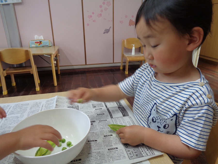 すじをとり、指でグリンピースを上手に取り出しました~