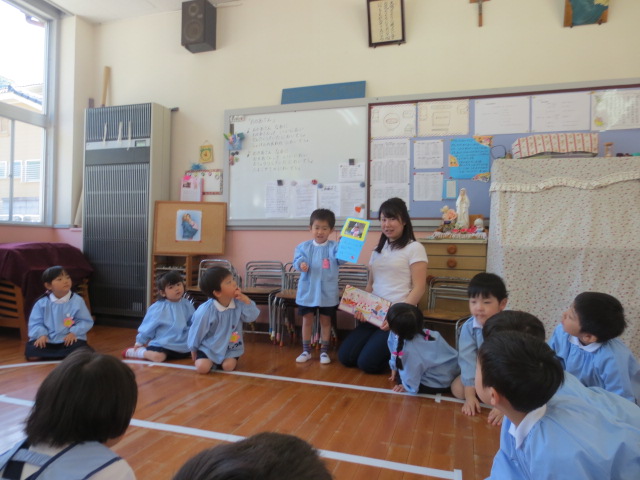この日、保健所の先生と長崎国際大学の2名の学生がきて、食育についてエプロンシアターをしてくれました。