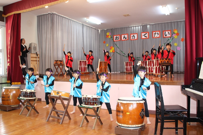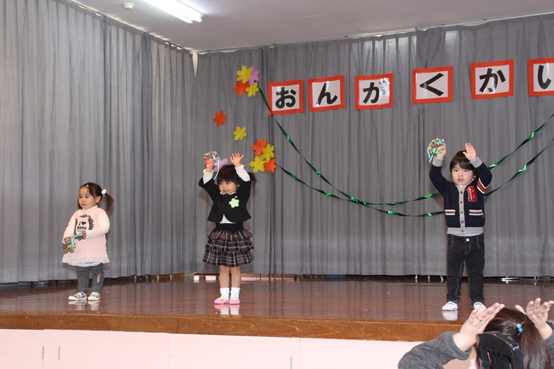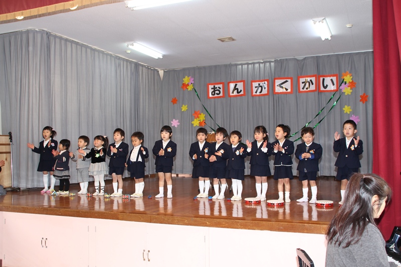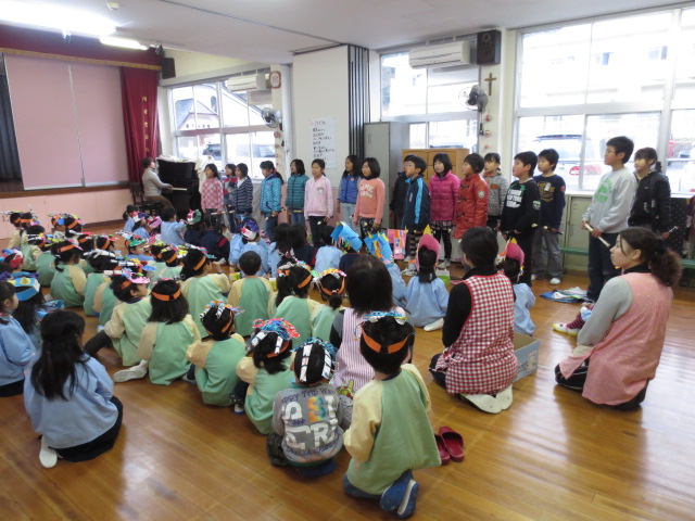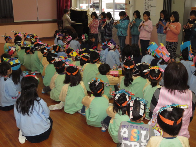 小学生と幼児園の子どもたちがそろい、まずは3年生が歌とリコーダーの演奏を聞かせてくれました。