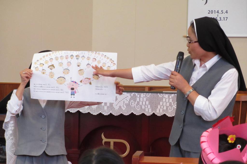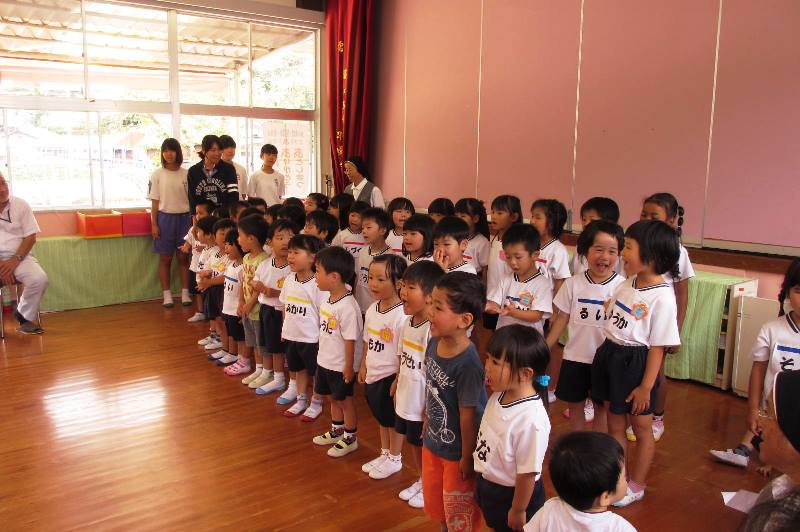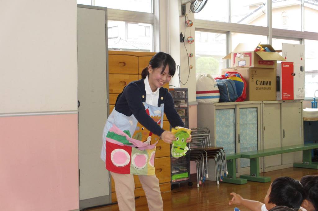 この日、保健所の先生と長崎国際大学の2名の学生がきて、食育についてエプロンシアターをしてくれました。