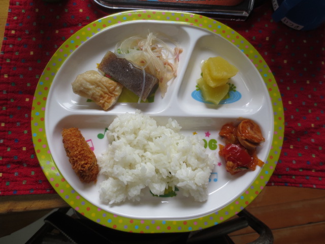 ごまささみカツ・うま煮・白菜のおかか和え・ポテトサラダ・フルーツ