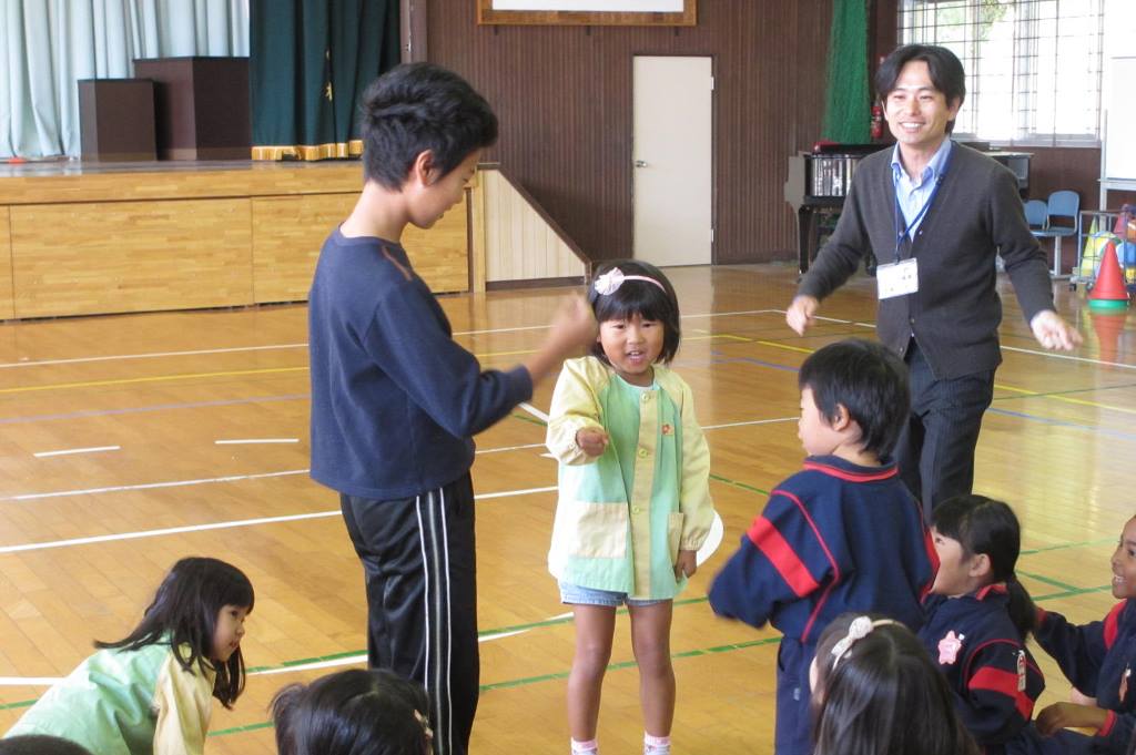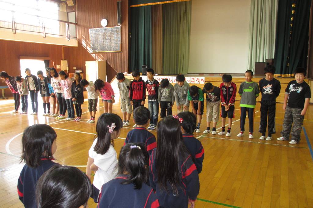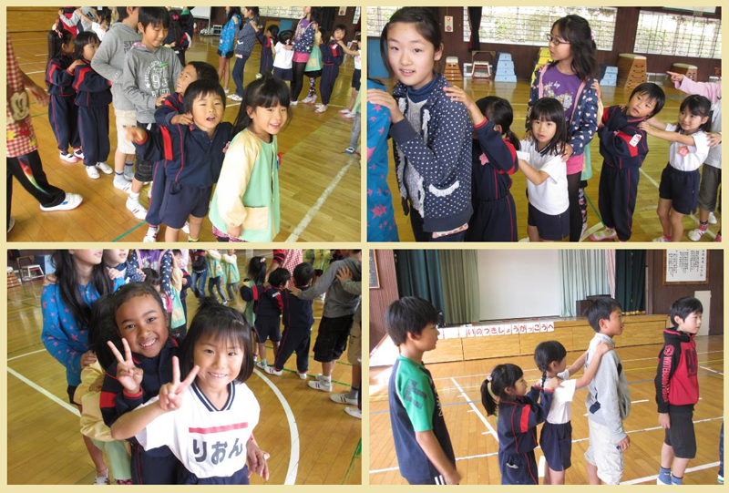 小学校へ着くとまずは、ひろ~い体育館へ。大きな体育館に驚いていました。