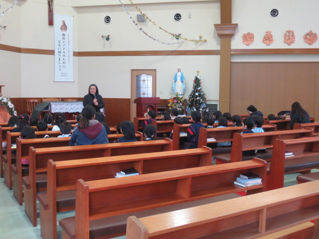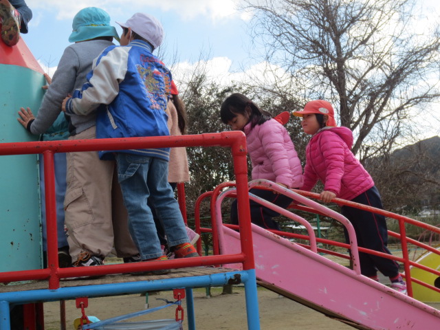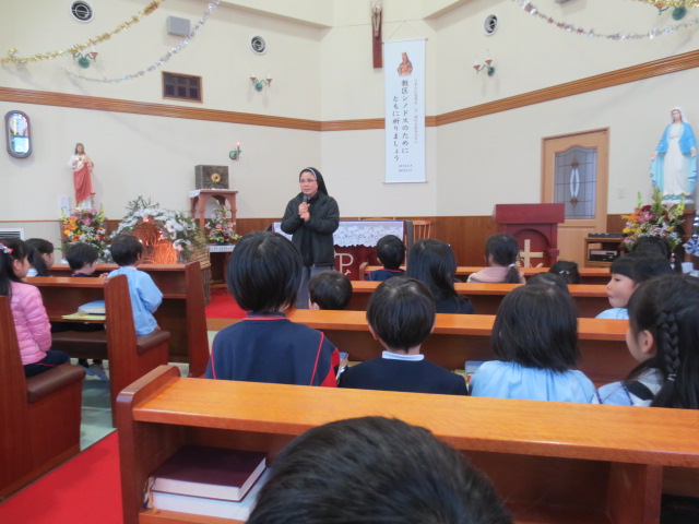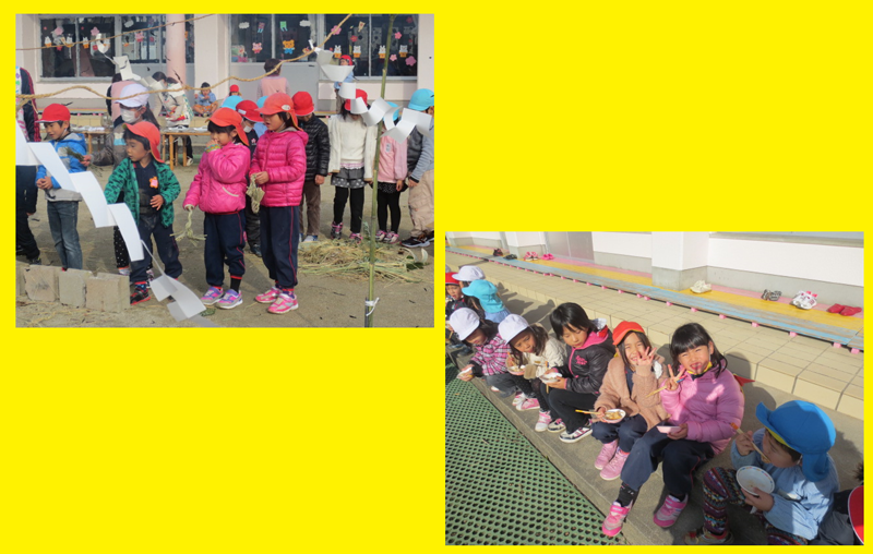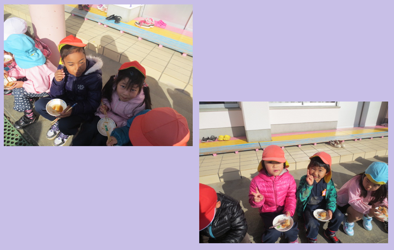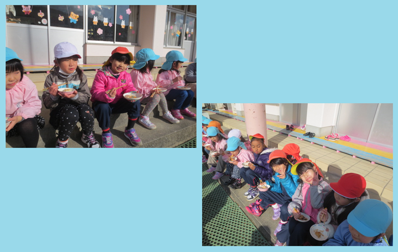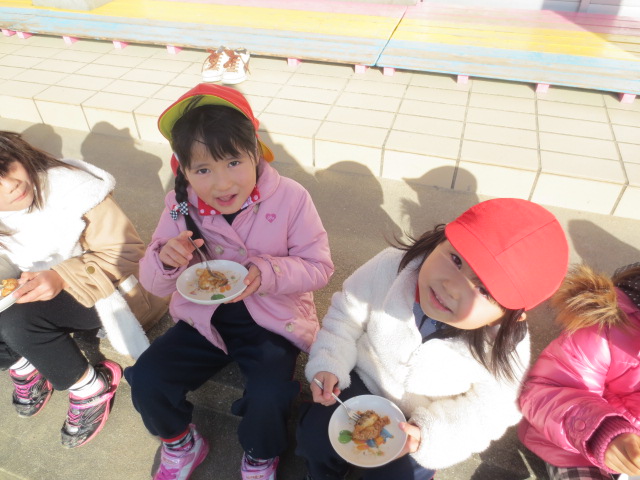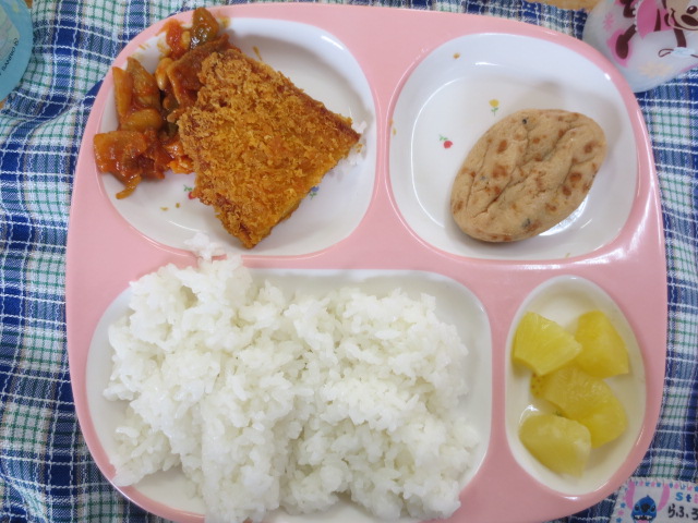 お魚ハンバーグケチャップ煮・野菜かき揚げ・焼きビーフン・大根の胡麻和え・フルーツ
