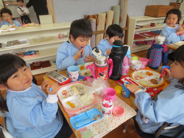 初めての給食はとってもおいしかったそうです。あっという間におかわりがなくなり、クラスの友達と食べると食欲がますのかも・・・気持ちよく給食がなくなりました。