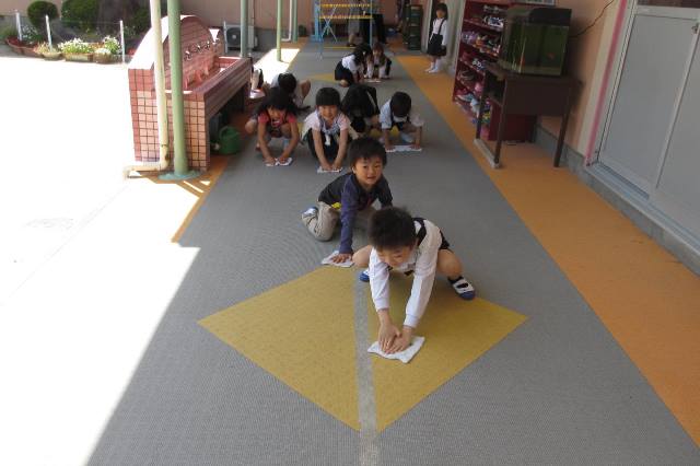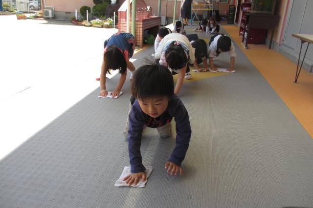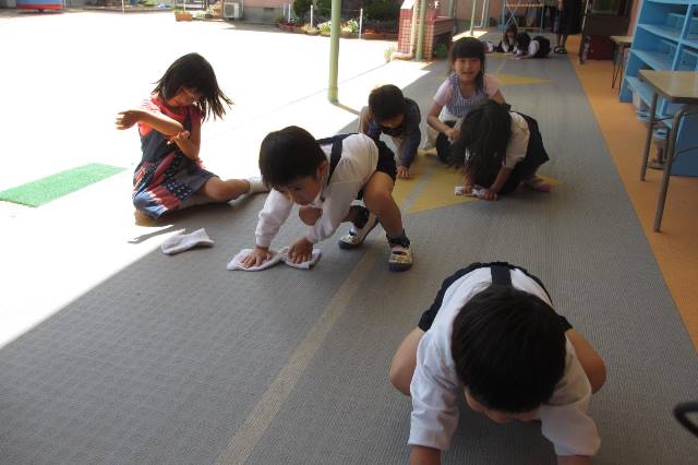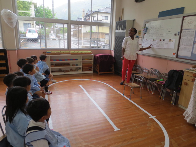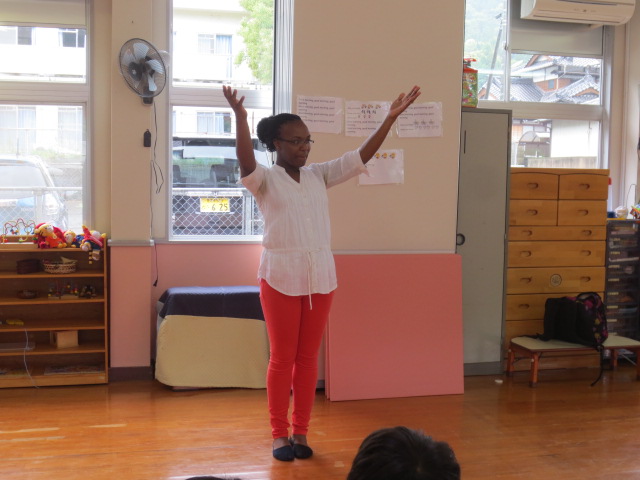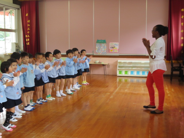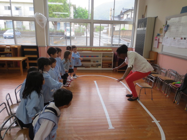 立つ、座る、回る、手をたたくなど英語のよびかけにこたえ