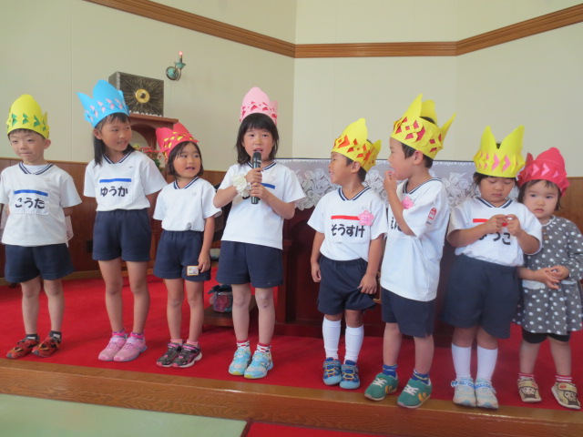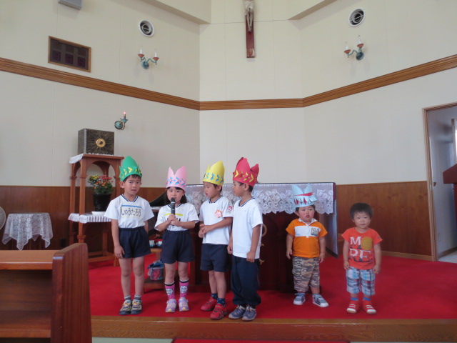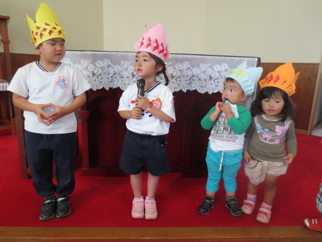 イエスさま、マリアさまに見守られながら元気にご挨拶をしました。