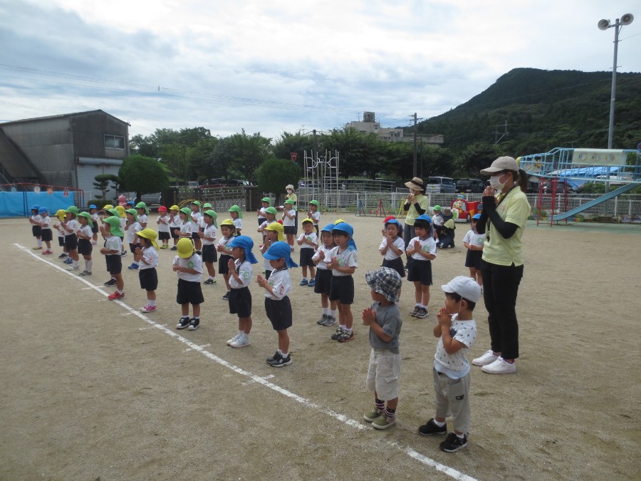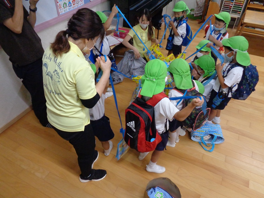 縦割り保育で初めて火災時の避難の仕方の練習をしました。