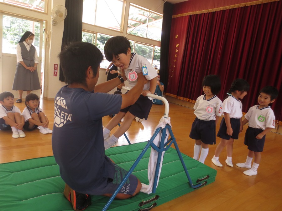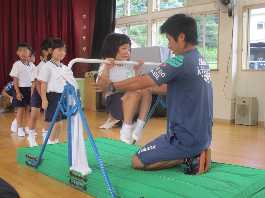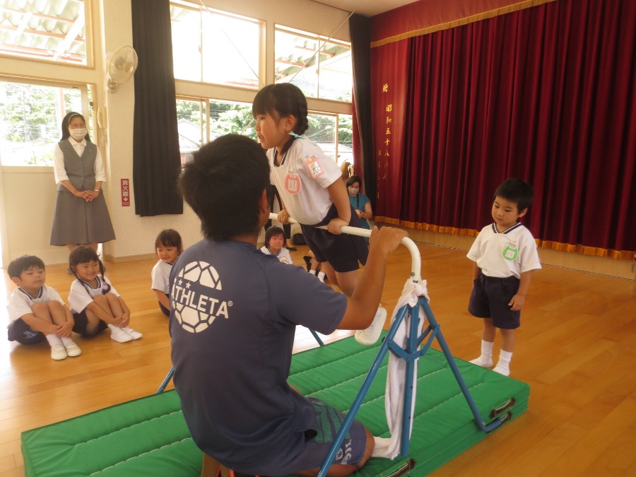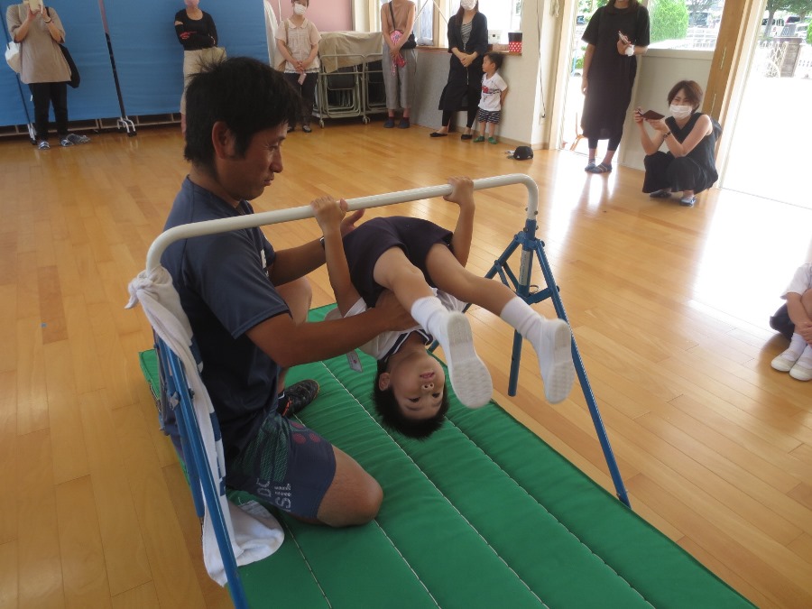 鉄棒をしっかり握って、先生に教えてもらいながら