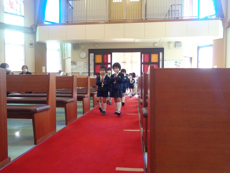 年少組・満3歳のお友達は七五三の全体練習の前に教会の中で静かにする事や、しかっり