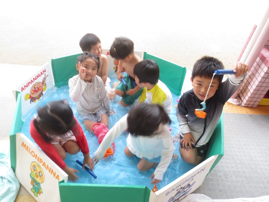 初めての水遊び、少しお水にびっくりしたお友達もいましたが