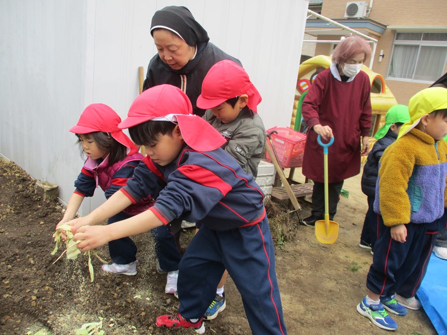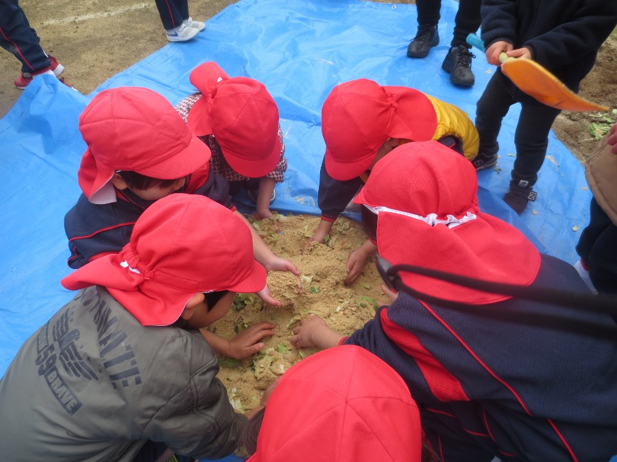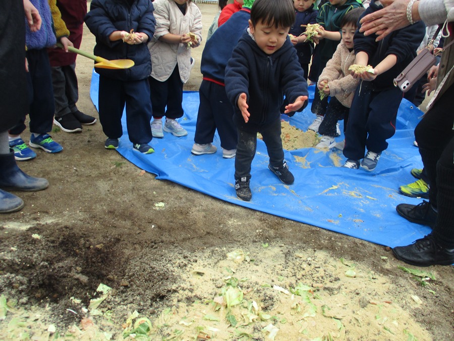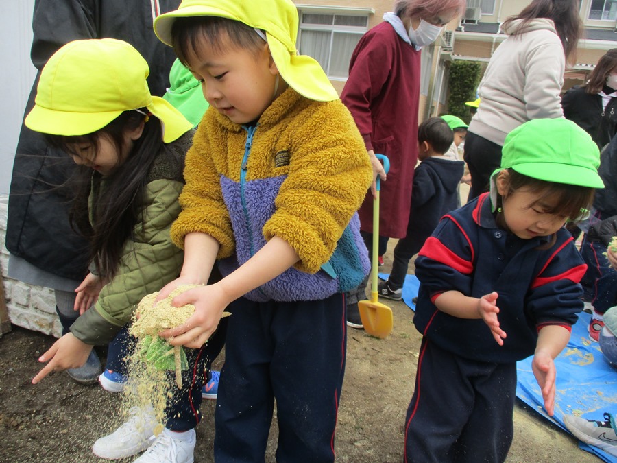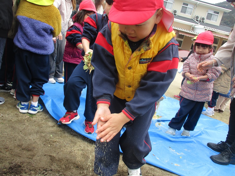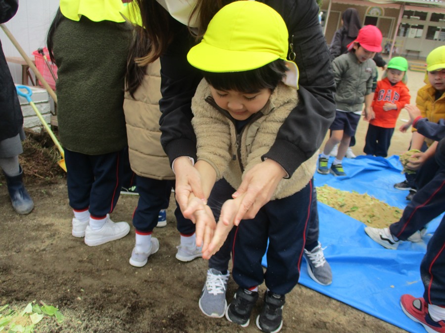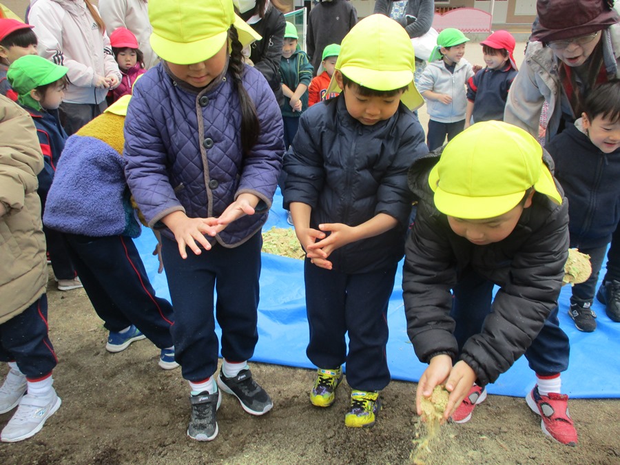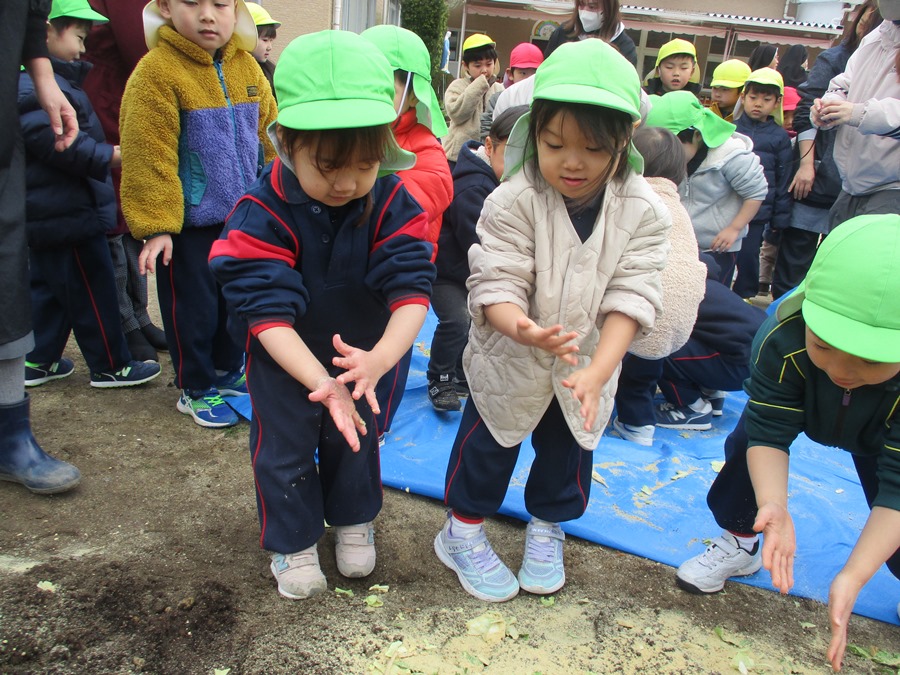 手のひらいっぱいに土を持ったら、畑の上にかけていきます☆彡