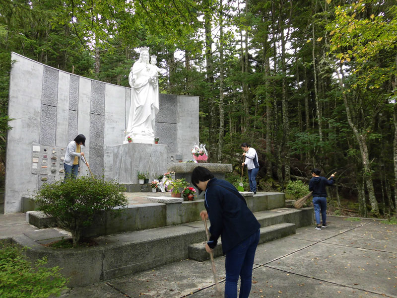 今回は、修学志願者の宮崎出発を前に お別れ遠足で富士の聖母巡礼に出かけました。マリア像の周囲を掃除して ロザリオの祈りをお捧げ・・・。