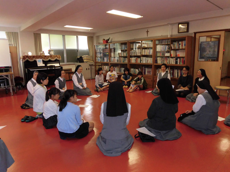 自然に輪になって近況報告。管区本部修道院の院長さまに「サムエル」のお話を聞き、ほっこりした雰囲気の中始まりました。